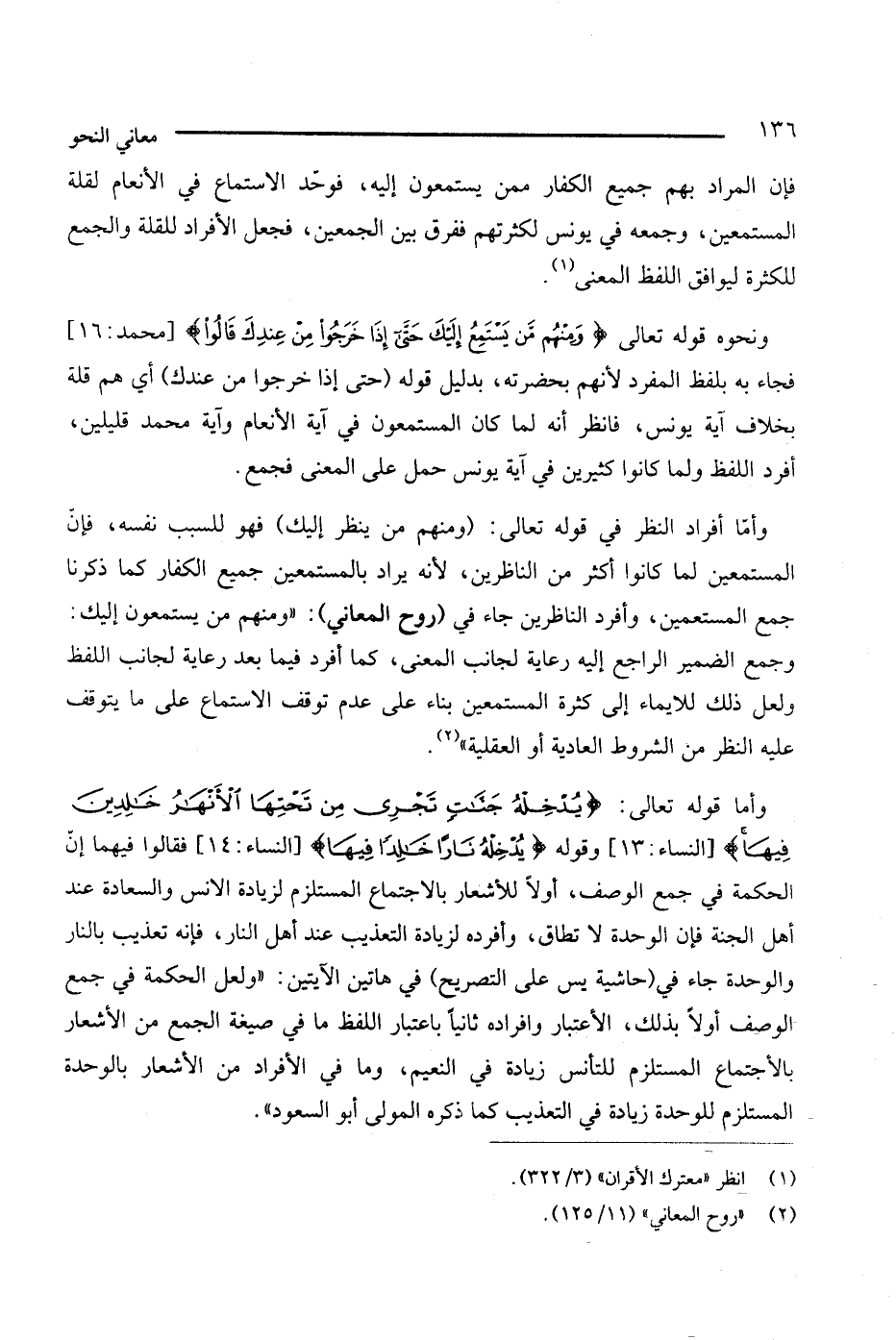 ونحوه قوله تعالى: {ومنهم من يستمع إليك حتى إذا خرجوا من عندك قالوا} [محمد: 16]، فجاء به بلفظ المفرد لأنهم بحضرته، بدليل قوله (حتى إذا خرجوا من عندك) أي هم قلة بخلاف آية يونس، فانظر أنه لما كان المستمعون في آية الأنعام وآية محمد قليلين، أفرد اللفظ ولما كانوا كثيرين في آية يونس حمل على المعنى فجمع.