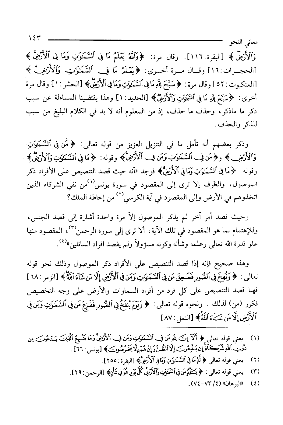 وهذا صحيح فإه إذا قصد التنصيص على الأفراد ذكر الموصول وذلك نحو قوله تعالى: {ونفخ في الصور فصعق من في السماوت ومن في الأرض إلا من شاء الله} [الزمر: 68]، فهنا قصد التنصيص على كل فرد من أفراد السماوات والأرض على وجه التخصيص فكرر (من) لذلك. ونحوه قوله تعالى: {ويوم ينفخ في الصور ففزع من في السماوات ومن في الأرض إلا من شاء الله} [النمل: 87].
