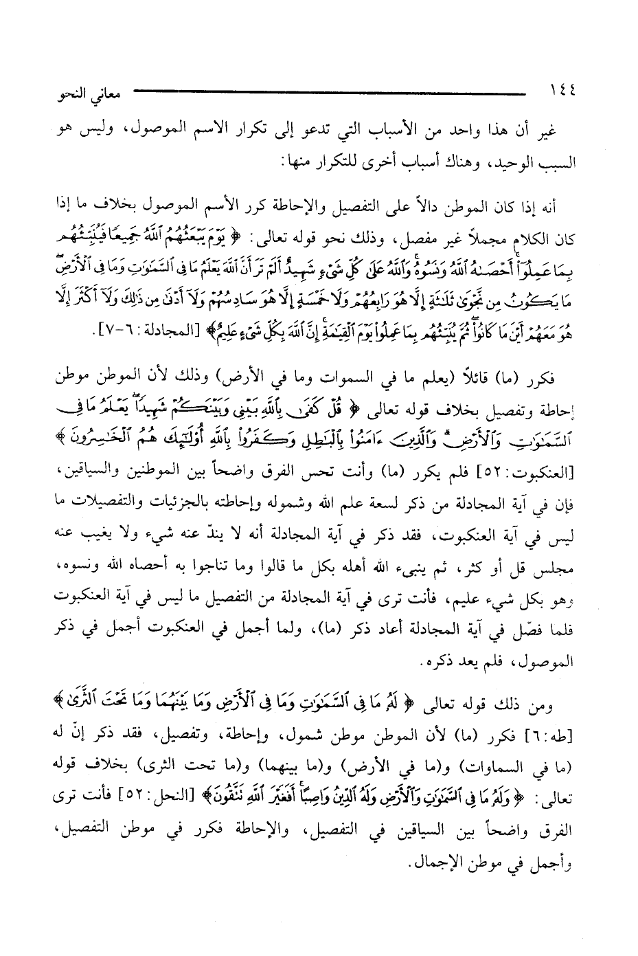 ومن ذلك قوله تعالى: {له ما في السماوات وما في الأرض وما بينهما وما تحت الثرى} [طه: 6]، فكرر (ما) لأن الموطن موطن شمول، وإحاطة، وتفصيل، فقد ذكر إنّ له (ما في السماوات) و (ما في الأرض) و (ما بينهما) و (ما تحت الثرى) بخلاف قوله تعالى: {وله ما في السماوات والأرض وله الدين واصبًا أفغير الله تتقون} [النحل: 52]، فأنت ترى الفرق واضحًا بين السياقين في التفصيل، والإحاطة فكرر في موطن التفصيل وأجمل في موطن الإجمال.