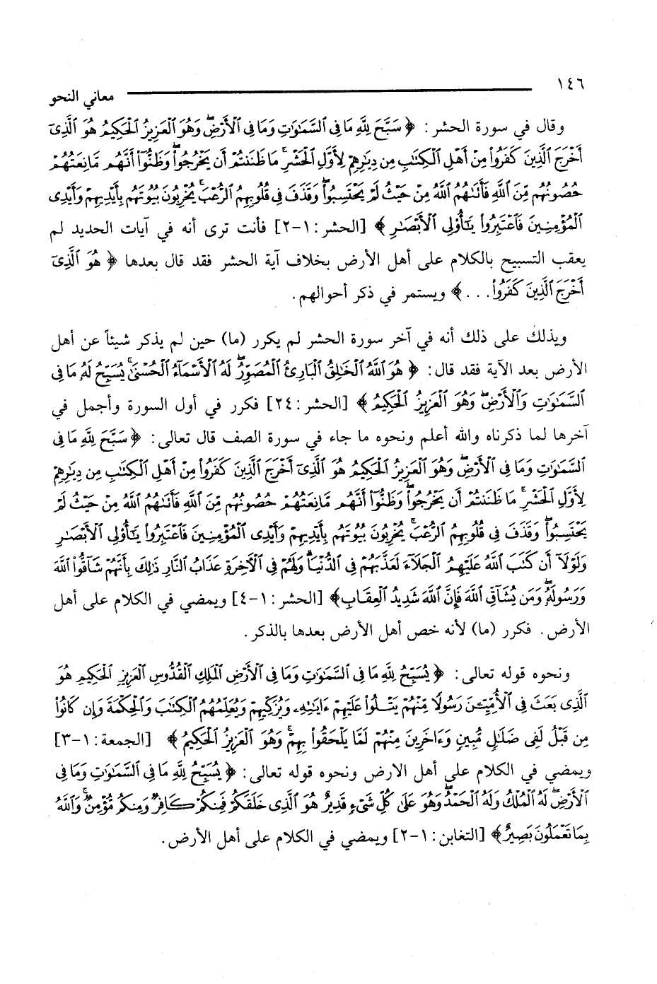 ونحوه قوله تعالى: {يسبح لله ما في السماوات وما في الأرض الملك القدوس العزيز الحكيم هو الذي بعث في الأميين رسولا منهم يتلوا عليهم آياته ويزكيهم ويعلمهم الكتاب والحكمة وإن كانوا من قبل لقي ضلال مبين وآخرين منهم لما يحلقوا بهم وهو العزيز الحكيم} [الجمعة: 1 - 3]، ويمضى في الكلام على أهل الأرض ونحوه قوله تعالى: {يسبح لله ما في السماوات وما في الأرض له الملك وله الحمد هو على كل شيء قدير هو الذي خلقكم فمنكم كافر ومنكم مؤمن والله بما تعملون بصير} [التغابن: 1 - 2]، ويمضى في الكلام على أهل الأرض.