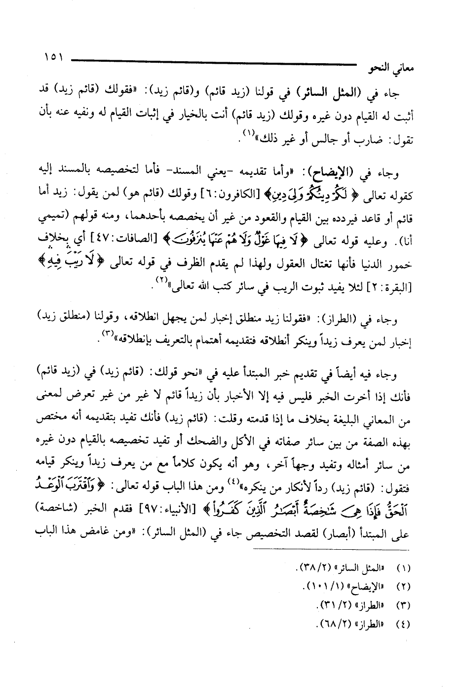 جاء في (المثل السائر) في قولنا (زيد قائم) و (قائم زيد): "فقولك (قائم زيد) قد أثبت له القيام دون غيره وقولك (زيد قائم) أنت بالخيار في إثبات القيام له ونفيه عنه بأن تقول: ضارب أو جالس أو غير ذلك" (¬1).