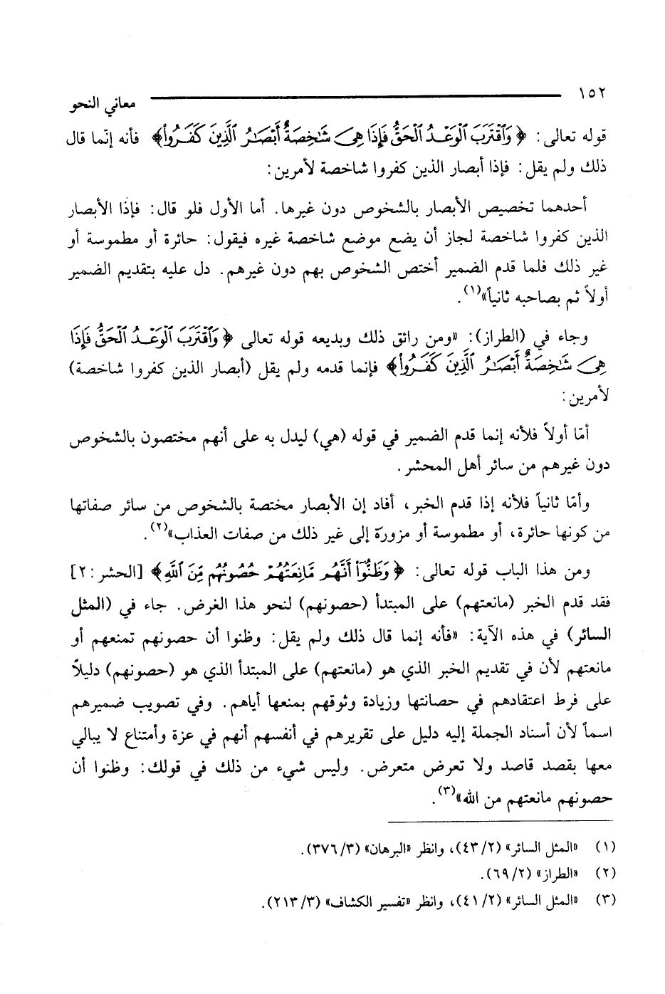 أحدهما: تخصيص الأبصار بالشخوص دون غيرها. أما الأول فلو قال: فإذا الأبصار الذين كفروا شاخصة لجاز أن يضع موضع شاخصة غيره فيقول: حائرة أو مطموسة أو غير ذلك فلما قدم الضمير أختص الشخوص بهم دون غيرهم. دل عليه بتقديم الضمير أولا ثم بصاحبه ثانيا" (¬1).