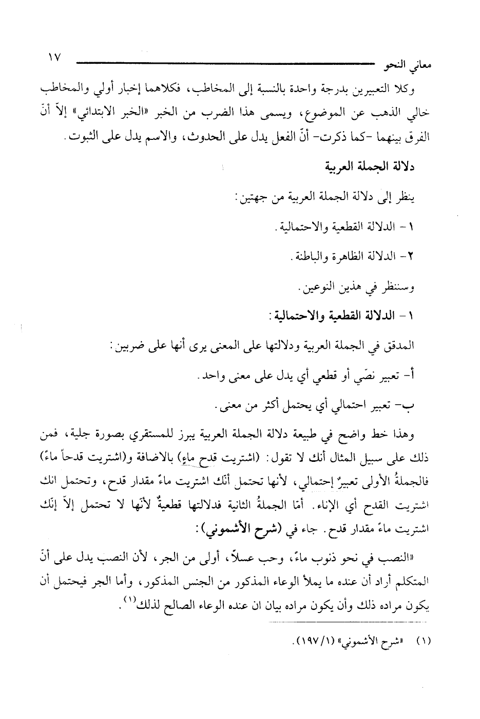 وهذا خط واضح في طبيعة دلالة الجملة العربية يبرز للمستقري بصورة جلية، فمن ذلك على سبيل المثال أنك لا تقول: (اشتريت قدح ماء) بالاضافة (واشتريت قدحا ماء) فالجملة الأولى تعبير إحتمالي، لأنها تحتمل أنك اشتريت ماء مقدار قدح، وتحتمل أنك اشتريت القدح أي الإناء. أما الجملة الثانية فدلالتها قطعية لأنها لا تحتمل إلا أنك اشتريت ماء مقدار قدح. جاء في (شرح الأشموني):
