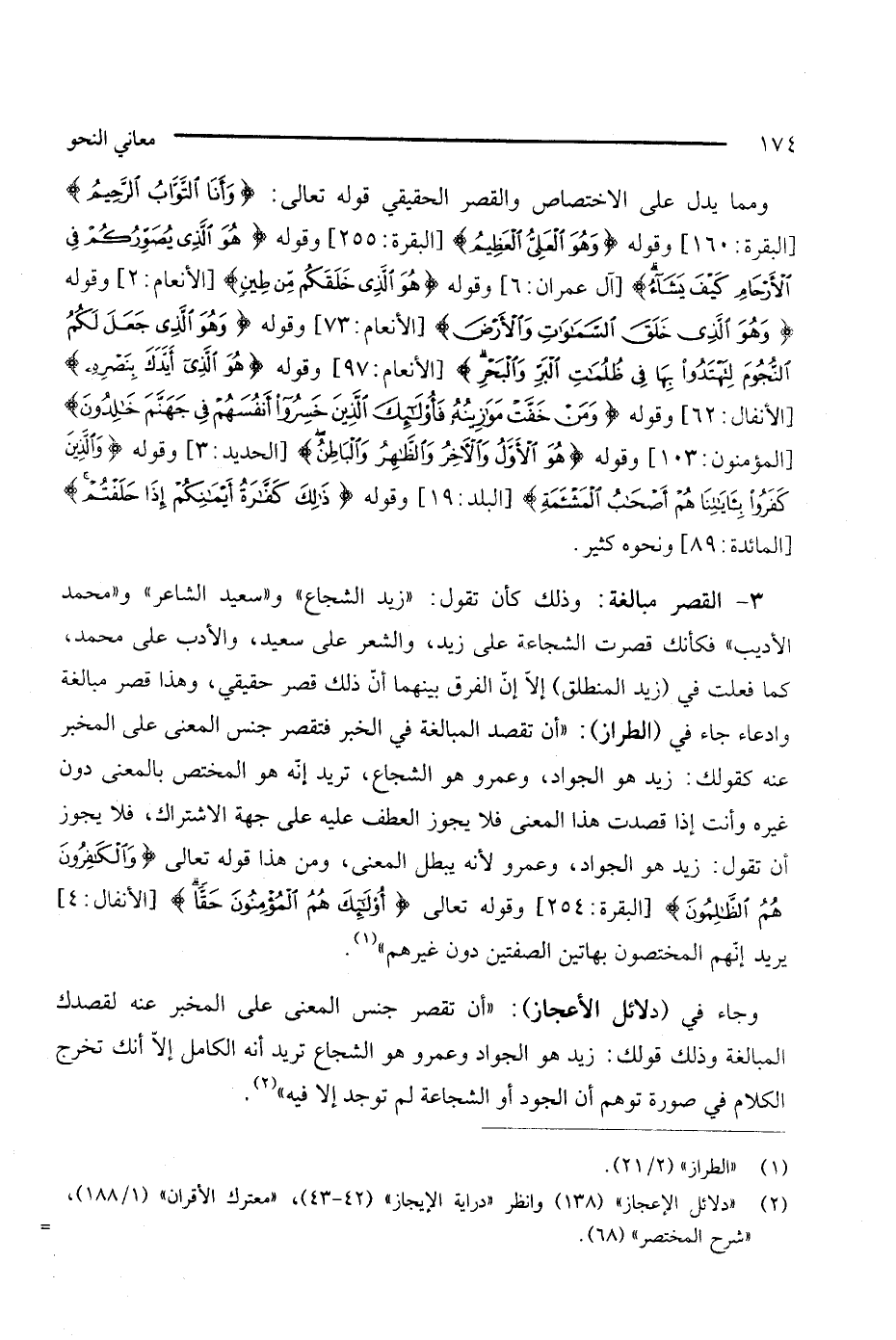 3 - القصر مبالغة: وذلك كأن تقول: "زيد الشجاع"، و "سعيد الشاعر"، و (محمد الأديب)، فكأنك قصرت الشجاعة على زيد والشعر على سعيد، والأدب على محمد، كما فعلت في (زيد المنطلق) إلا إنا لفرق بينهما أن ذلك قصر حقيقي، وهذا قصر مبالغة وادعاء جاء في (الطراز): "أن تقصد المبالغة في الخبر فتقصر جنس المعنى على المخبر عنه كقولك: زيد هو الجواد، وعمرو هو الشجاع، تريد إنه هو المختص بالمعنى دون غيره وأنت إذا قصدت هذا المعنى فلا يجوز العطف عليه على جهة الاشتراك، فلا يجوز أن تقول: زيد هو الجواد، وعمرو لأنه يبطل المعنى، ومن هذا قوله تعالى {والكافرون هم الظالمون} [البقرة: 254]، وقوله تعالى: {أولئك هم المؤمنون حقًا}: [الأنفال: 4] يريد إنهم المختصون بهاتين الصفتين دون غيرهم". (¬1)