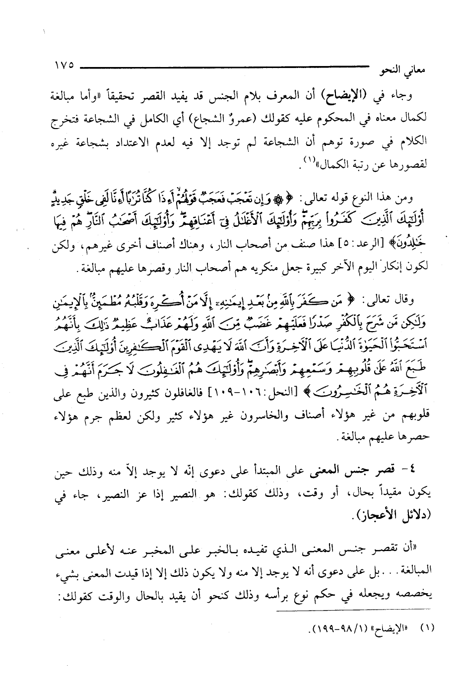 وجاء في (الإيضاح) أن المعرف بلام الجنس قد يفيد القصر تحقيقا "وأما مبالغة لكمال معناه في المحكوم عليه كقولك (عمرو الشجاع) أي الكامل في الشجاعة فتخرج الكلام في صورة توهم أن الشجاعة لم توجد إل فيه لعدم الاعتداد بشجاعة غيره لقصورها عن رتبة الكمال" (¬1).