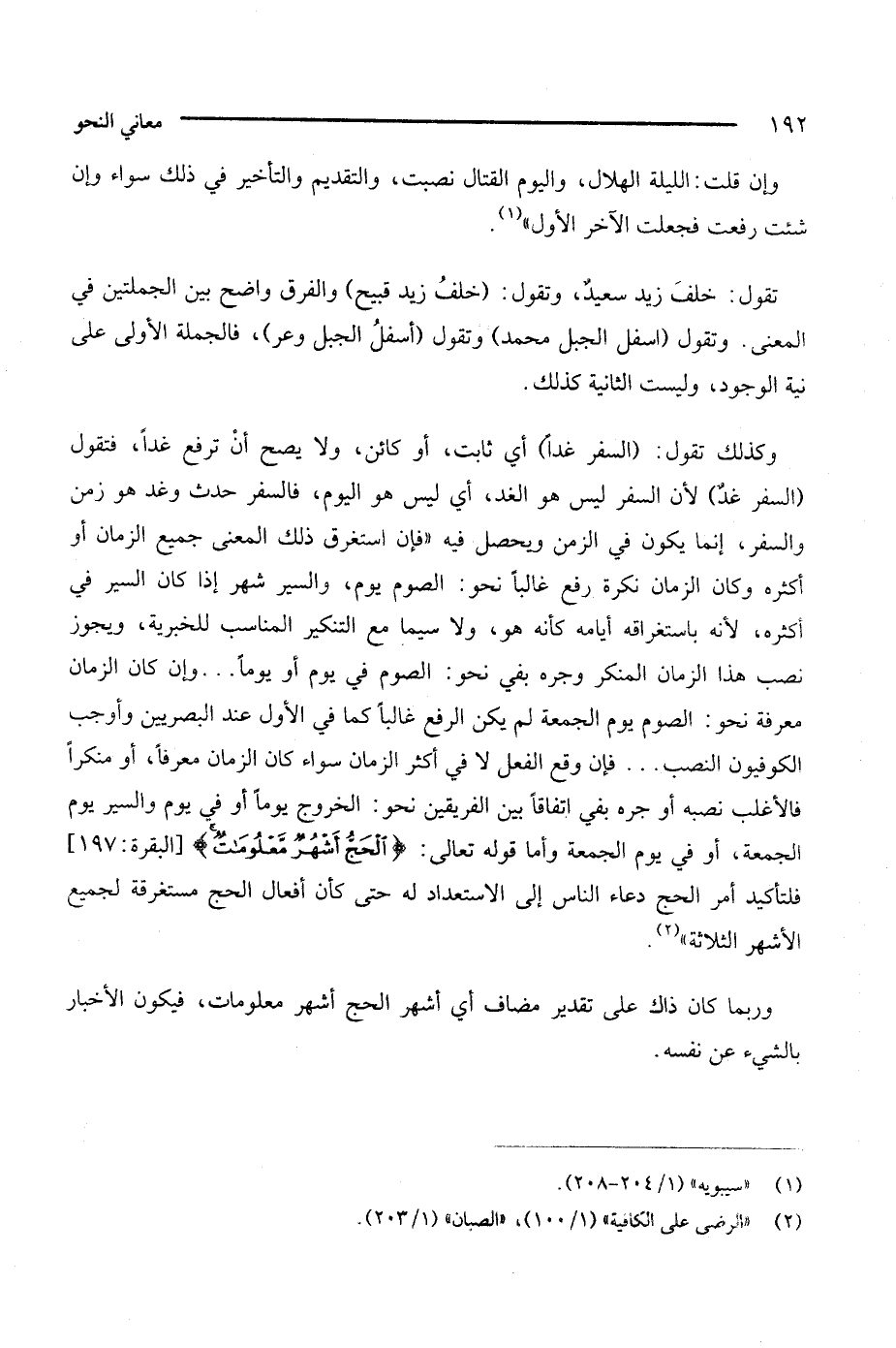 وكذلك تقول: (السفر غدًا) أي ثابت، أو كائن، ولا يصح أن ترفع غدًا، فتقول (السفر غدٌ)، لأن السفر ليس هو الغد، أي ليس هو اليوم، فالسفر حدث وغد هو زمن والسفر، إنما يكون في الزمن ويحصل فيه "فإن استغرق ذلك المعنى جميع الزمان، أو أكثره وكان الزمان نكرة رفع غالبا نحو: الصوم يوم، والسير شهر، إذا كان السير في أكثره، لأنه باستغراقه ايامه كأنه هو، ولا سيما مع التنكير المناسب للخبرية، ويجوز نصب هذا الزمان المنكر وجره بفي نحو: الصوم في يوم أو يومًا .. وإن كان الزمان معرفة نحو: الصوم يوم الجمعة لم يكن الرفع غالبا كما في الأول عند البصريين وأوجب الكوفيون النصب .. فإن وقع الفعل لا في أكثر الزمان سواء كان الزمان معرفا، أو منكرا فالأغلب نصبه أو جره بقي اتفاقا بين الفريقين نحو: الخروج يومًا أو في يوم والسير يوم الجمعة، أو في يوم الجمعة، وأما قوله تعالى: {الحج أشهرٌ معلوماتٌ} [البقرة: 197]، فلتأكيد أمر الحج دعاء الناس إلى الاستعداد له حتى كأن أفعال الحج مستغرقة لجميع الأشهر الثلاثة". (¬2)