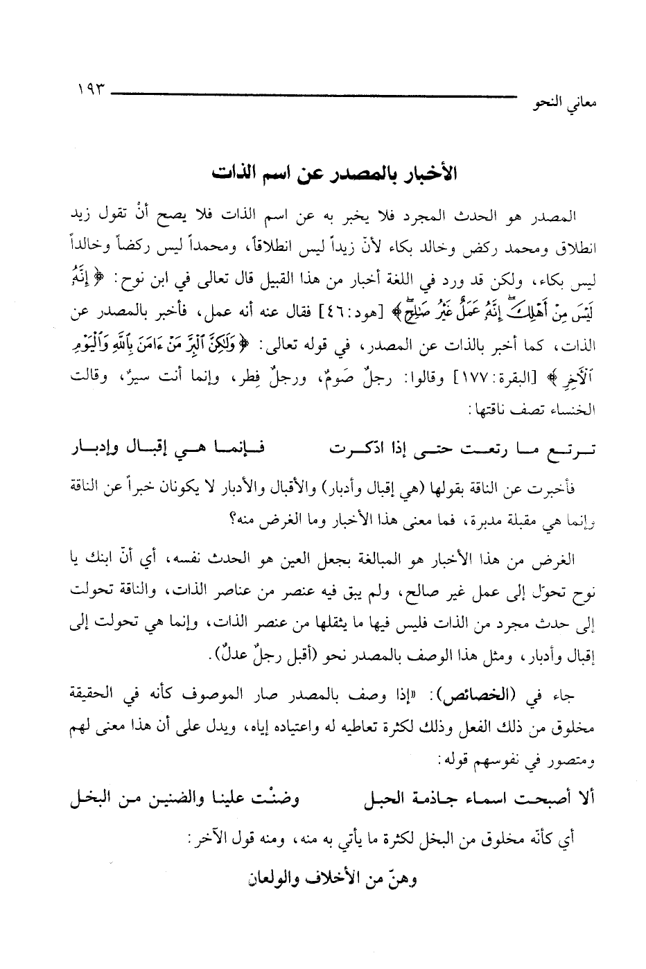 المصدر هو الحدث المجرد فلا يخبر به عن اسم الذات فلا يصح أن تقول زيد انطلاق ومحمد ركض وخالد بكاء لأن زيدًا ليس انطلاقا، ومحمدًا ليس ركضا، وخالدا ليس بكاء، ولكن قد ورد في اللغة أخبار من هذا القبيل قال تعالى في ابن نوح: {إنه ليس من أهلك إنه عمل غير صالح} [هود: 46]، فقال عنه أنه عمل، فأخبر بالمصدر، عن الذات كما أخبر بالذات عن المصدر، في قوله تعالى: {ولكن البر من آمن بالله واليوم الآخر} [البقرة: 177]، وقالوا: رجل صوم، ورجل فطر، وإنما أنت سير، وقالت الخنساء تصف ناقتها: