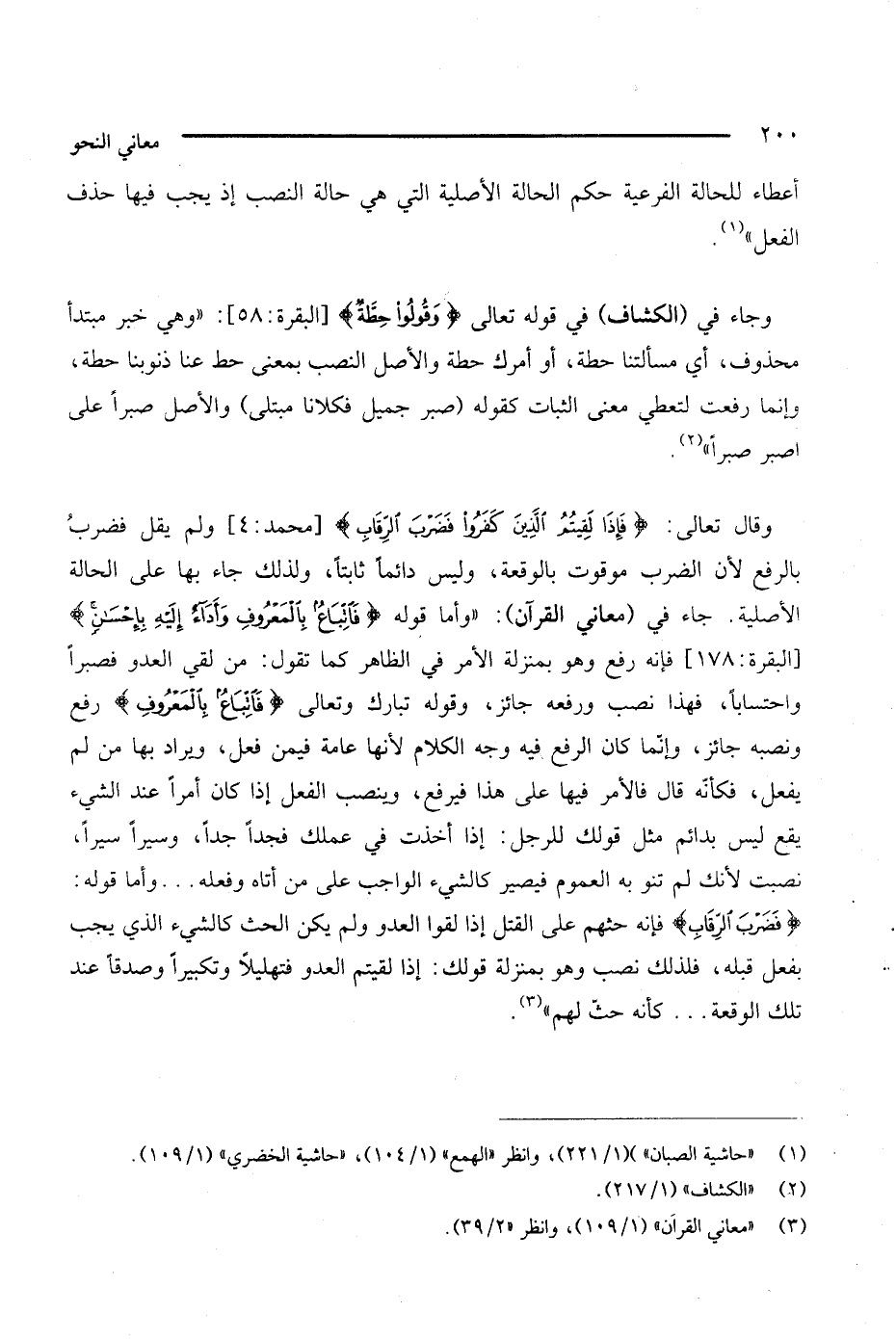 وقال تعالى: {فإذا لقيتم الذين كفروا فضرب الرقاب} [محمد: 4]، ولم يقل فضرب بالرفع لأن الضرب موقوت بالوقعة، وليس دائمًا ثابتا، ولذلك جاء بها على الحالة الأصلية. جاء في (معاني القرآن): "وأما قوله {فاتباع بالمعروف وأداء إليه بإحسان}، [البقرة: 178]، فإنه رفع وهو بمنزلة الأمر في الظاهر كما تقول: من لقي العدو فصبرا واحتسابا، فهذا نصب ورفعه جائز، وقوله تبارك وتعالى {فاتباع بالمعروف} رفع ونصبه جائز، وإنما كان الرفع فيه وجه الكلام، لأنها عامة فيمن فعل، ويراد بها من لم يفعل، فكأنه قال فالأمر فيها على هذا فيرفع، وينصب الفعل إذا كان أمرًا عند الشيء يقع ليس بدائم مثل قولك للرجل: إذا أخذت في عملك فجدا جدًا، وسيرا سيرا، نصبت لأنك لم تنو به العموم فيصير كالشيء الواجب على ما أتاه وفعله ... وأما قوله: {فضرب الرقاب} فإنه حثهم على القتل إذا لقوا العدو ولم يكن الحث كالشيء الذي يجب بفعل قبله، فلذلك نصب وهو بمنزلة قولك: إذا لقيتم العدو فتهليلا وتكبيرا وصدقا عند تلك الوقعة .. كأنه حث لهم" (¬3).