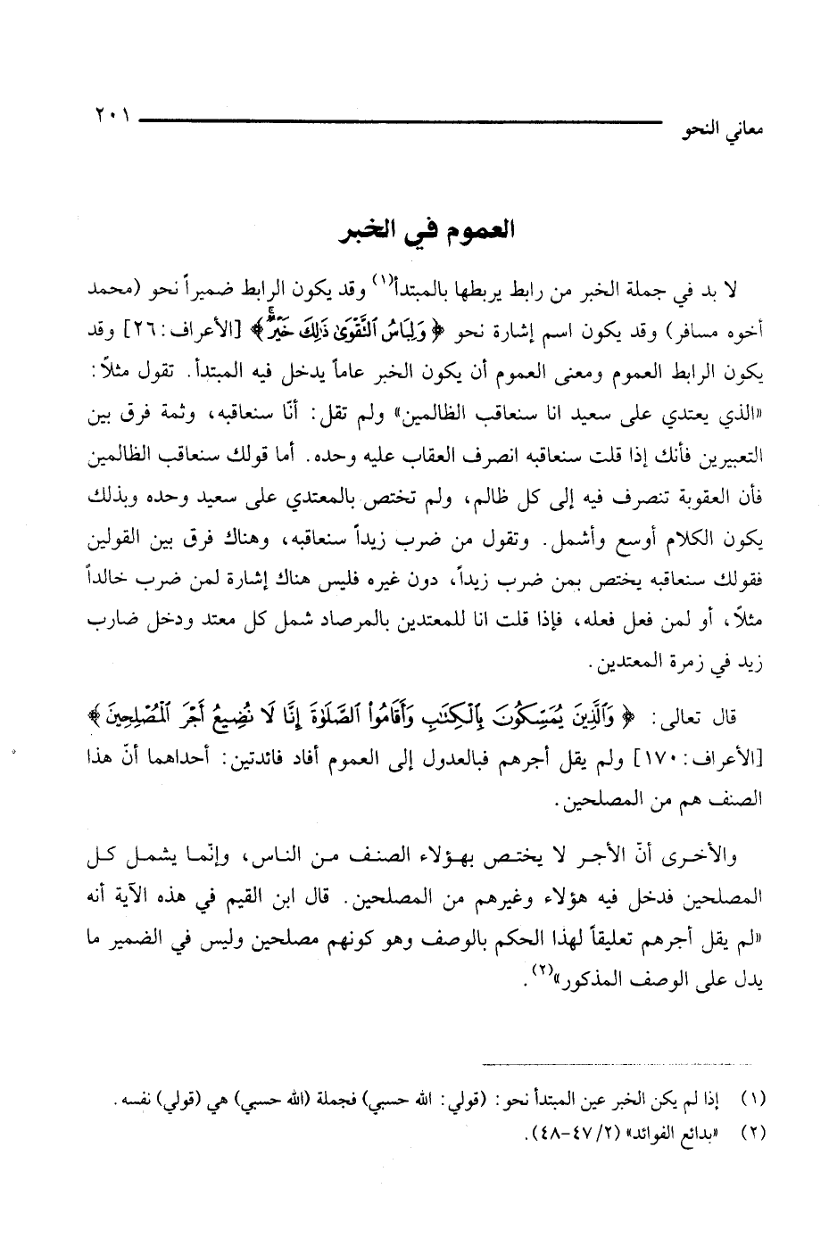 قال تعالى: {والذين يمسكون بالكتاب وأقاموا الصلاة إنا لا نضيع أجر المصلحين} [الأعراف: 170]، ولم يقل أجرهم فبالعدول إلى العموم أفاد فائدتين: أحداهما أن هذا الصنف هم من المصلحين.