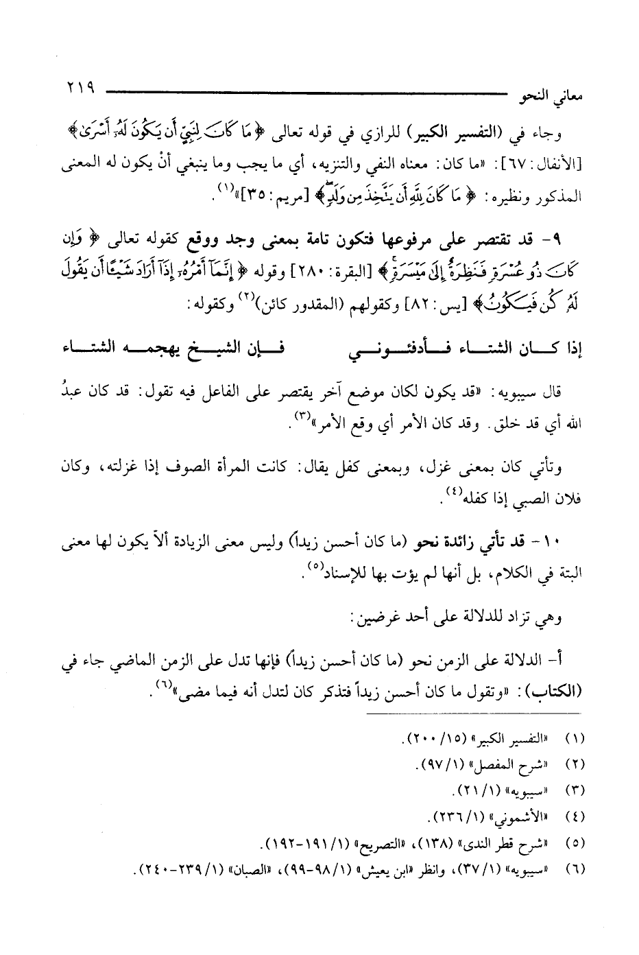10 - قد يأتي زائدة نحو (ما كان أحسن زيدًا) وليس معنى الزيادة ألا يكون لها معنى البتة في الكلام، بل أنها لم يؤت بها للإسناد (¬5).