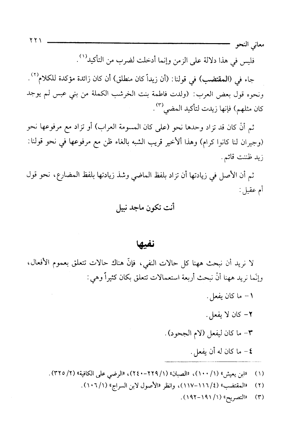 لا نريد أن نبحث ههنا كل حالات النفي، فإن هناك حالات تتعلق بعموم الأفعال، وإنما نريد ههنا أن نبحث أربعة استعمالات تتعلق بكان كثيرًا وهي: