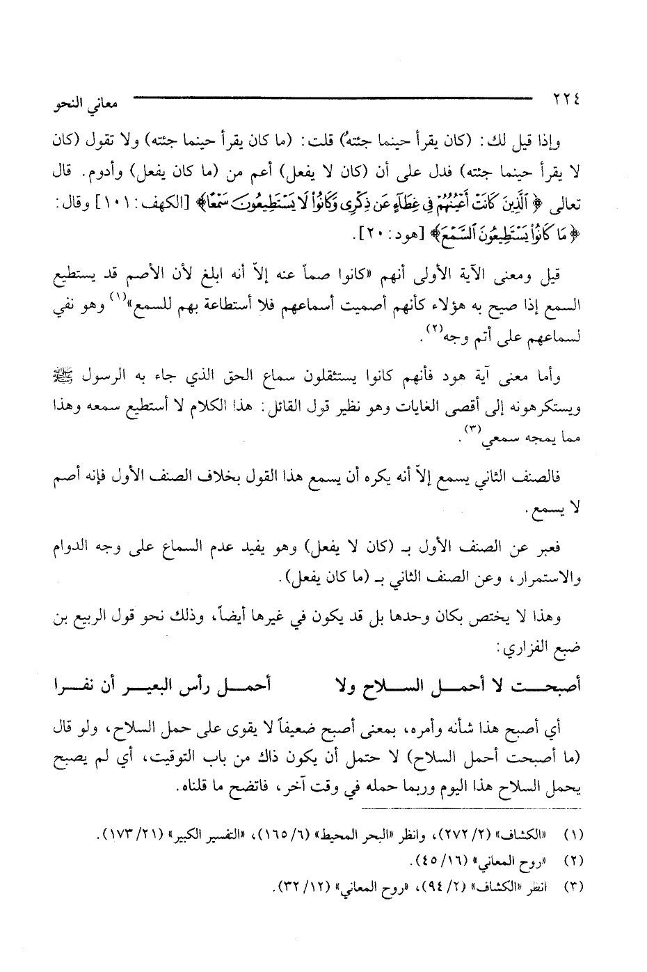 وإذا قيل لك: (كان يقرأ حينما جئته) قلت: (ما كان يقرأ حينما جئته) ولا تقول (كان لا يقرأ حينما جئته) فدل على أن (كان لا يفعل) أعم من (ما كان يفعل) وأدوم. قال تعالى: {الذين كانت أعينهم في غطاء عن ذكري وكانوا لا يستطيعون سمعًا} [الكهف: 101]، وقال: {ما كانوا يستطيعون السمع} [هود: 20].