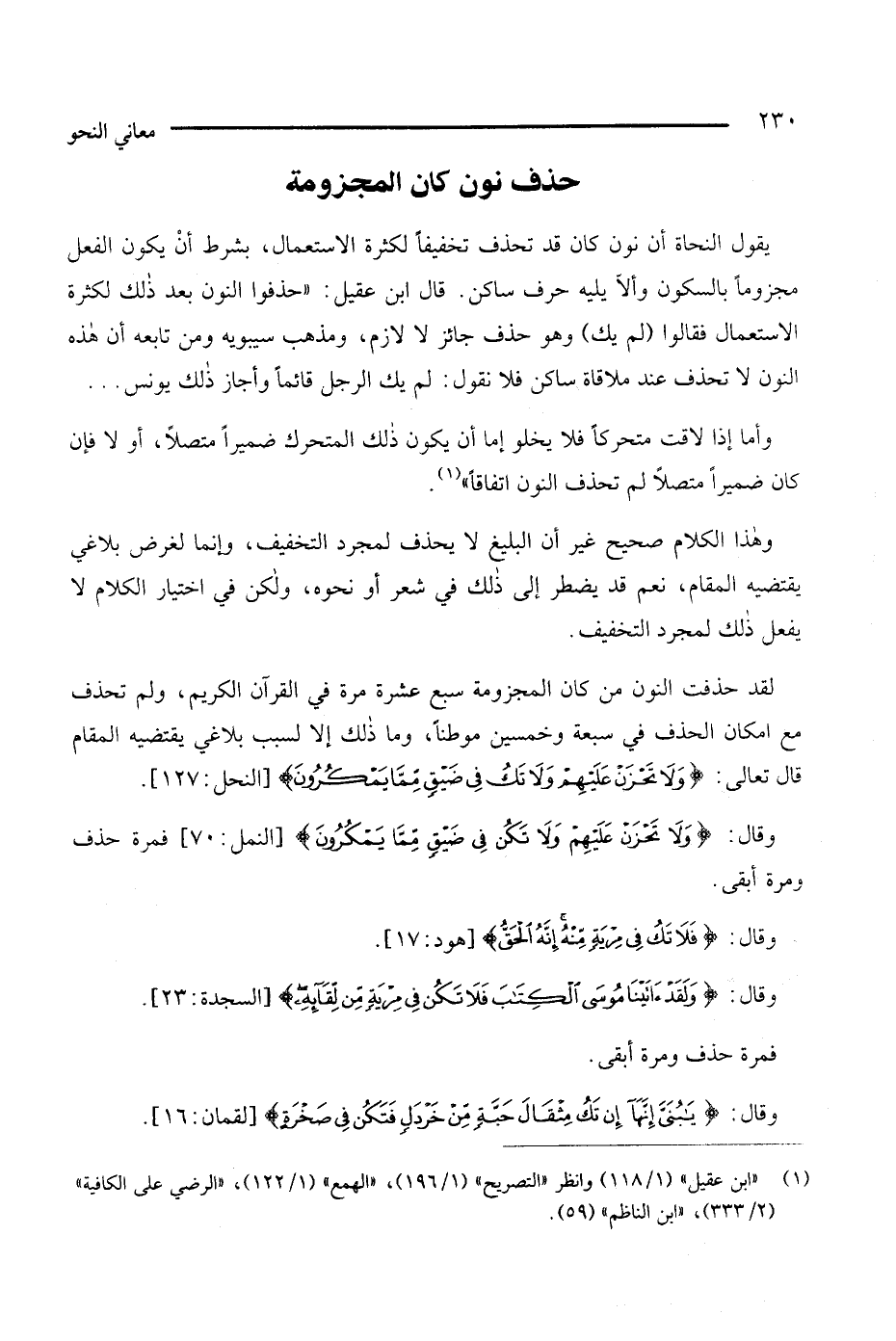 لقد حذفت النون من كان المجزومة سبع عشرة مرة في القرآن الكريم، ولم تحذف مع إمكان الحذف في سبعة وخمسين موطنًا، وما ذلك إلا لسبب بلاغي يقتضيه المقام قال تعالى: {ولا تحزن عليهم ولا تك في ضيق مما يمكرون} [النحل: 127].