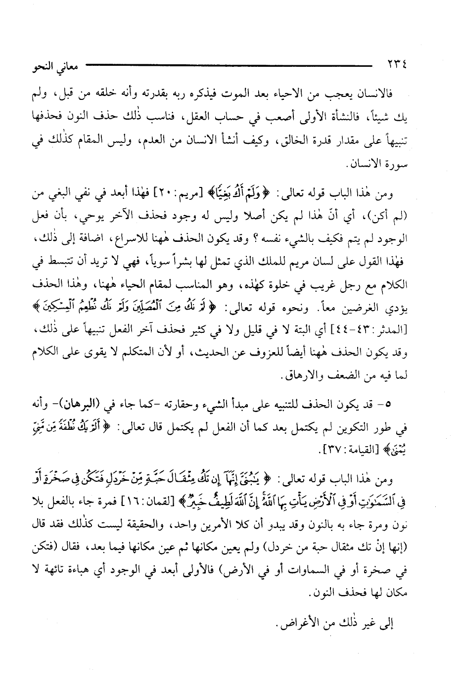 ومن هذا الباب قوله تعالى: {يابني إنها إن تك مثقال حبة من خردل فتكن في صخرة أو في السماوات أو في الأرض يأت بها الله إن الله لطيف خبير} [لقمان: 16]، فمرة جاء بالفعل بلا نون ومرة جاء بالنون وقد يبدو أن كلا الأمرين واحد، والحقيقة ليست كذلك فقد قال (إنها إن تك مثقال حبة من خردل) ولم يعين مكانها ثم عين مكانها فيما بعد، فقال (فتكن في صخرة أو في السماوات أو في الأرض)، فالأولى أبعد في الوجود أي هباءة تائهة لا مكان لها فحذف النون.