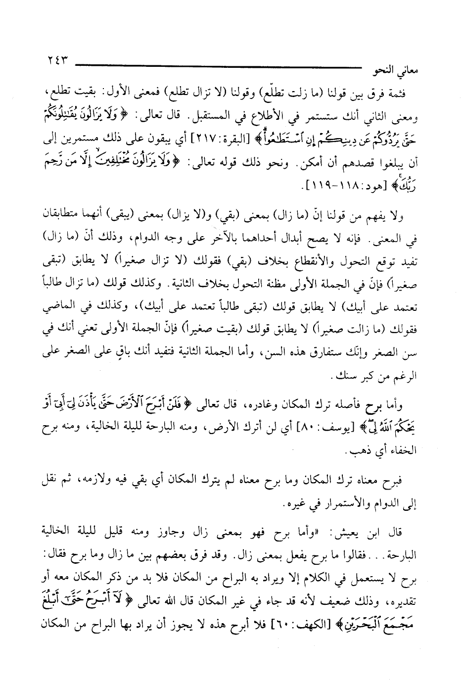 فثمة فرق بين قولنا (مازلت تطلع) وقولنا (لا تزال تطلع) فمعنى الأول: بقيت تطلع، ومعنى الثاني أنك ستستمر في الإطلاع في المستقبل. قال تعالى: {ولا يزالون يقاتلونكم حتى يردوكم عن دينكم إن استطاعوا} [البقرة: 217]، أي يبقون على ذلك مستمرين إلى أن يبلغوا قصدهم أن أمكن. ونحو ذلك قوله تعالى: {ولا يزالون مختلفين إلا من رحم ربك} [هود: 118 - 119].