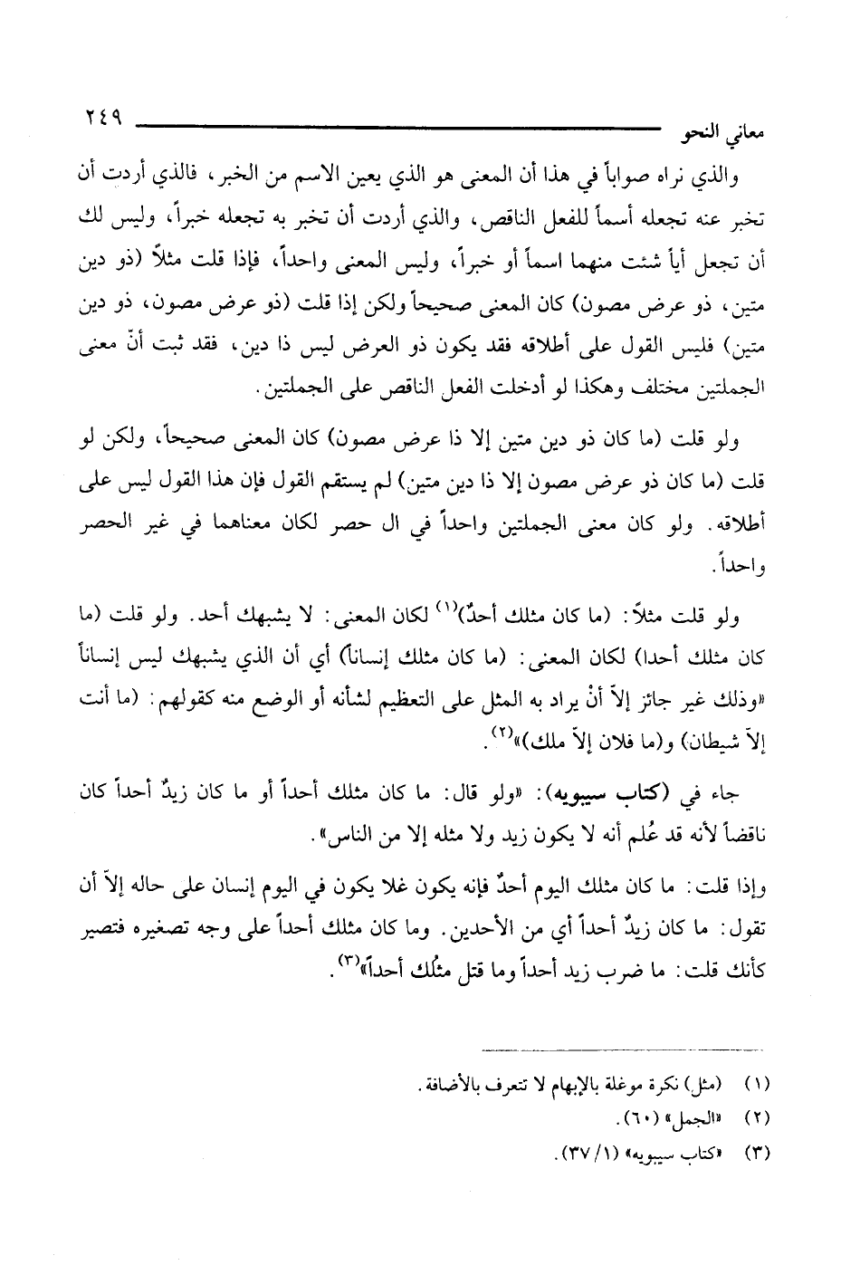 وإذا قلت: ما كان مثلك اليوم أحدٌ فإنه يكون غلا يكون في اليوم إنسان على حاله إلا أن تقول: ما كان زيدٌ أحدًا أي من الأحدين. وما كان مثلك أحدًا على وجه تصغيره فتصير كأنك قلت: ما ضرب زيد أحدًا وما قتل مثلك أحدًا" (¬3).
