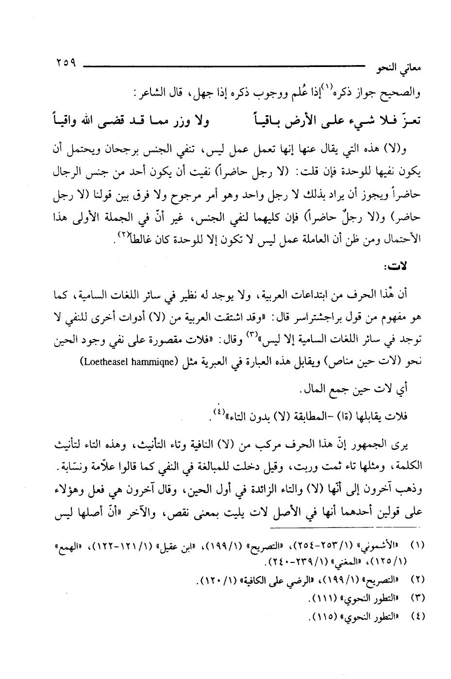 أن هذا الحرف من ابتداعات العربية، ولا يوجد له نظير في سائر اللغات السامية، كما هو مفهوم من قول براجشتراسر قال: "وقد اشتقت العربية من (لا) أدوات أخرى للنفي لا توجد في سائر اللغات السامية إلا ليس" (¬3) وقال: "فلات مقصورة على نفي وجود الحين نحو (لات حين مناص) ويقابل هذه العبارة في العبرية مثل (loetheasel hammiqne) أي لات حين جمع المال.