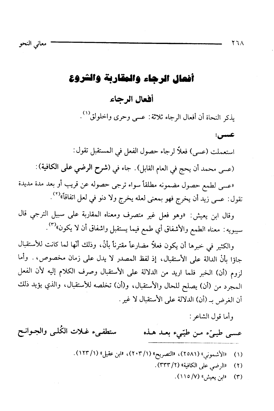 وقال ابن يعيش: "وهو فعل غير متصرف ومعناه المقاربة على سبيل الترجي، قال سيبويه: معناه الطمع والإشفاق أي طمع فيما يستقبل واشفاق أن لا يكون" (¬3).