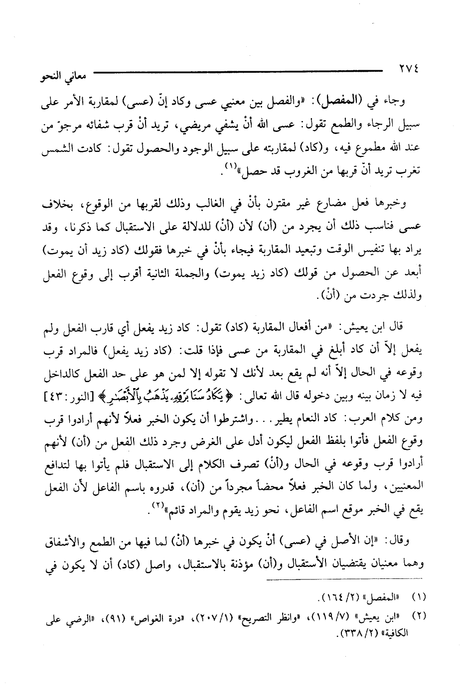 وجاء في (المفصل): ""والفصل بين معني عسى وكاد إن (عسى) لمقاربة الأمر على سبيل الرجاء والطمع تقول: عسى الله أن يشفي مريضي، تريد أن قرب شفائه مرجو من عند الله مطموع فيه، و (كاد) لمقاربته على سبيل الوجود والحصول تقول: كادت الشمس تغرب تريد أن قربها من الغروب قد حصل (¬1) ".