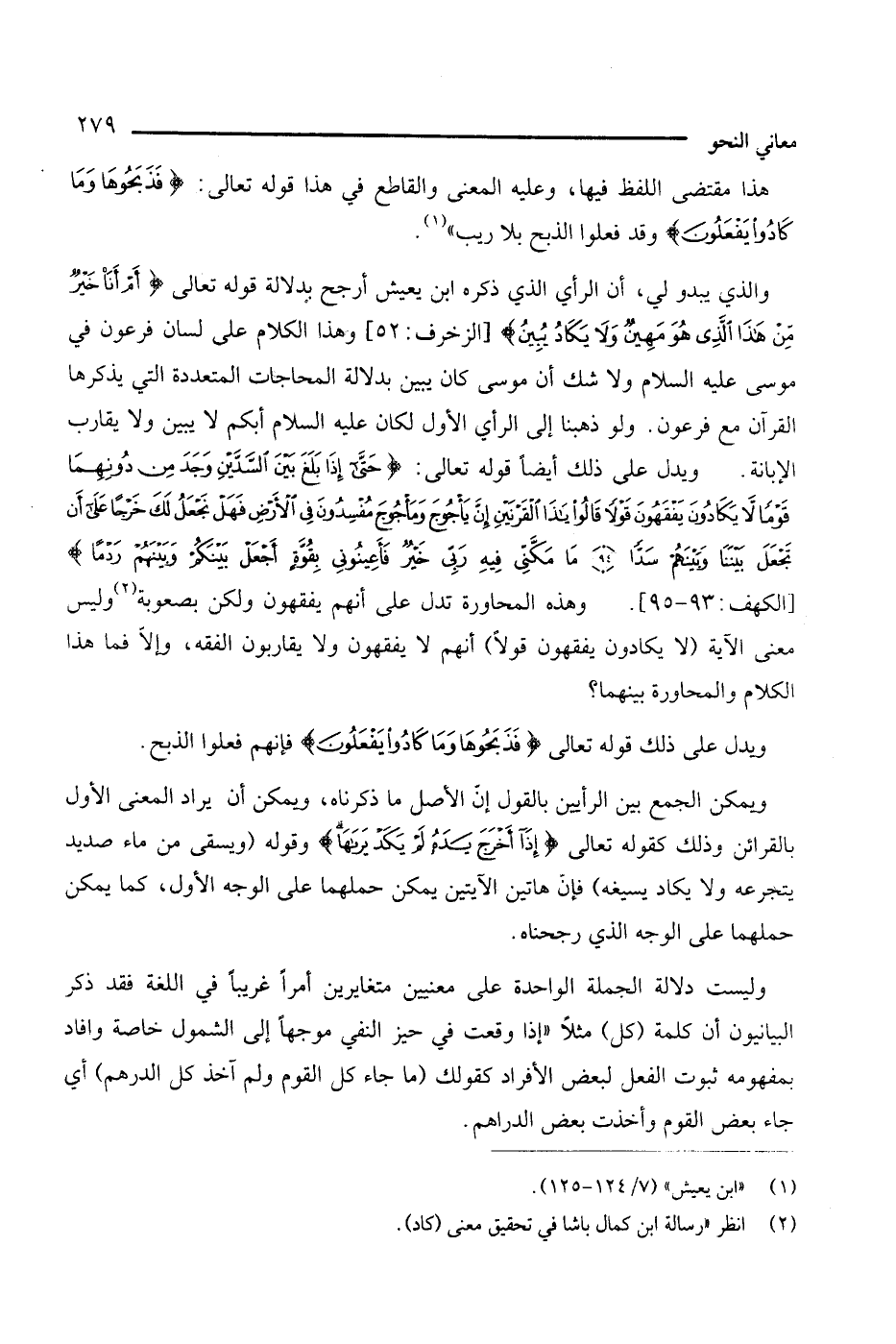 والذي يبدو لي، أن الرأي الذي ذكره ابن يعيش أرجح بدلالة قوله تعالى: {أم أنا خير من هذا الذي هو مهين ولا يكاد يبين} [الزخرف: 52]، وهذا الكلام على لسان فرعون في موسى عليه السلام ولا شك أن موسي كان يبين بدلالة المحاجات المتعددة التي يذكرها القرآن مع فرعون، ولو ذهبنا إلى الرأي الأول لكان عليه السلام أبكم لا يبين ولا يقارب الإبانة. ويدل على ذلك أيضا قوله تعالى: {حتى إذا بلغ بين السدين وجد من دونهما قوما لا يكادون يفقهون قولا قالوا ياذا القرنين إن يأجوج ومأجوج مفسدون في الأرض فهل نجعل لك خرجًا على أن تجعل بينا وبينهم سدا، ما مكني فيه ربي خير فأعينوني بقوة أجعل بينكم وبينهم ردما} [الكهف: 93 - 95]، وهذه المحاورة تدل على أنهم يفقهون ولكن بصعوبة (¬2) وليس معنى الآية (لا يكادون يفقهون قولا) أنهم لا يفقهون ولا يقاربون الفقه، وإلا فما هذا الكلام والمحاورة بينهما؟