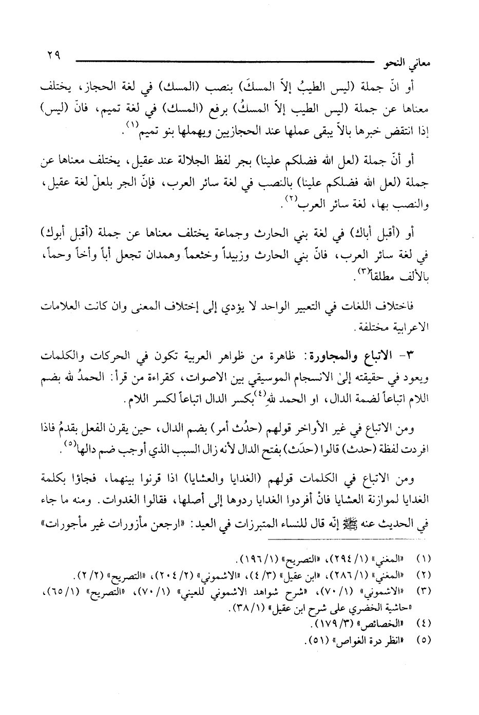 3 - الاتباع والمجاورة: ظاهرة من ظواهر العربية تكون في الحركات والكلمات ويعود في حقيقته إلى الانسجام الموسيقي بين الأصوات، كقراءة من قرأ: الحمدُ لله بضم اللام اتباعا لضمة الدال، أو الحمد للهِ (¬4) بكسر الدال اتباعا لكسر اللام.
