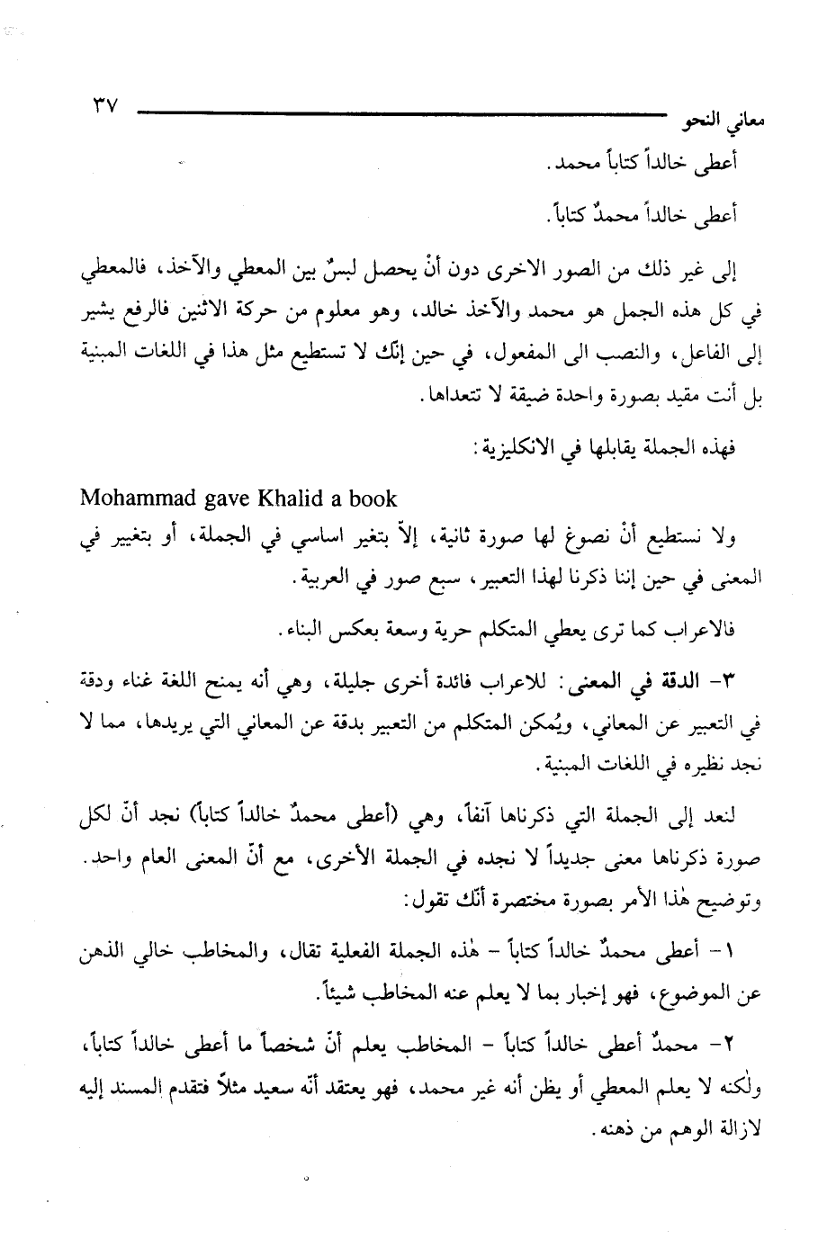 إلى غير ذلك من الصور الأخرى دون أن يحصل لبس بين المعطي والآخذ، فالمعطي في كل هذه الجمل هو محمد والآخذ خالد، وهو معلوم من حركة الاثنين فالرفع يشير إلى الفاعل، والنصب إلى المفعول في حين إنك لا تستطيع مثل هذا في اللغات المبنية بل أنت مقيد بصورة واحدة ضيقة لا تتعداها.