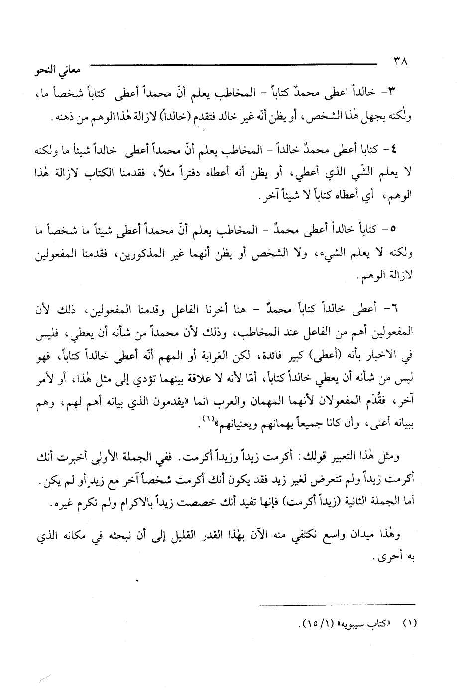 4 - كتابًا أعطي محمدٌ خالدًا - المخاطب يعلم أن محمدًا أعطي خالدًا شيئا ما ولكنه لا يعلم الشيء الذي أعطي، أو يظن أنه أعطاه دفترا مثلا، فقدمنا الكتاب لإزالة هذا الوهم، أي أعطاه كتابا لا شيئا آخر.