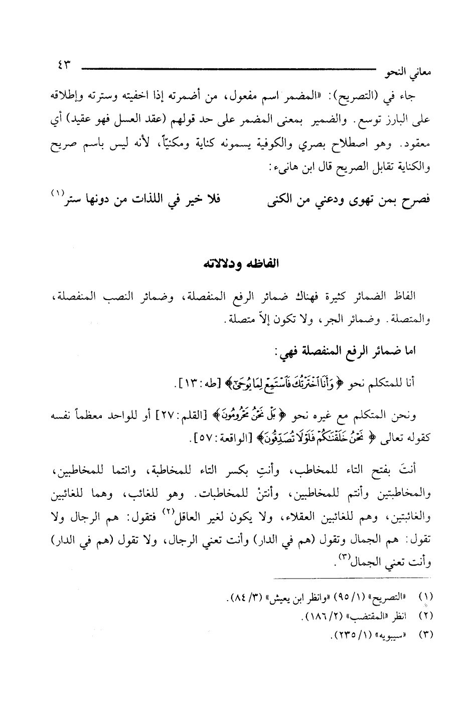جاء في (التصريح): " المضمر اسم مفعول، من أضمرته إذا أخفيته وسترته وإطلاقه على البارز توسع. والضمير بمعنى المضمر على حد قولهم (عقد العسل فهو عقيد) أي معقود. وهو اصطلاح بصري والكوفية يسمونه كناية ومكنيا، لأنه ليس باسم صريح والكناية تقابل الصريح قال ابن هانيء: