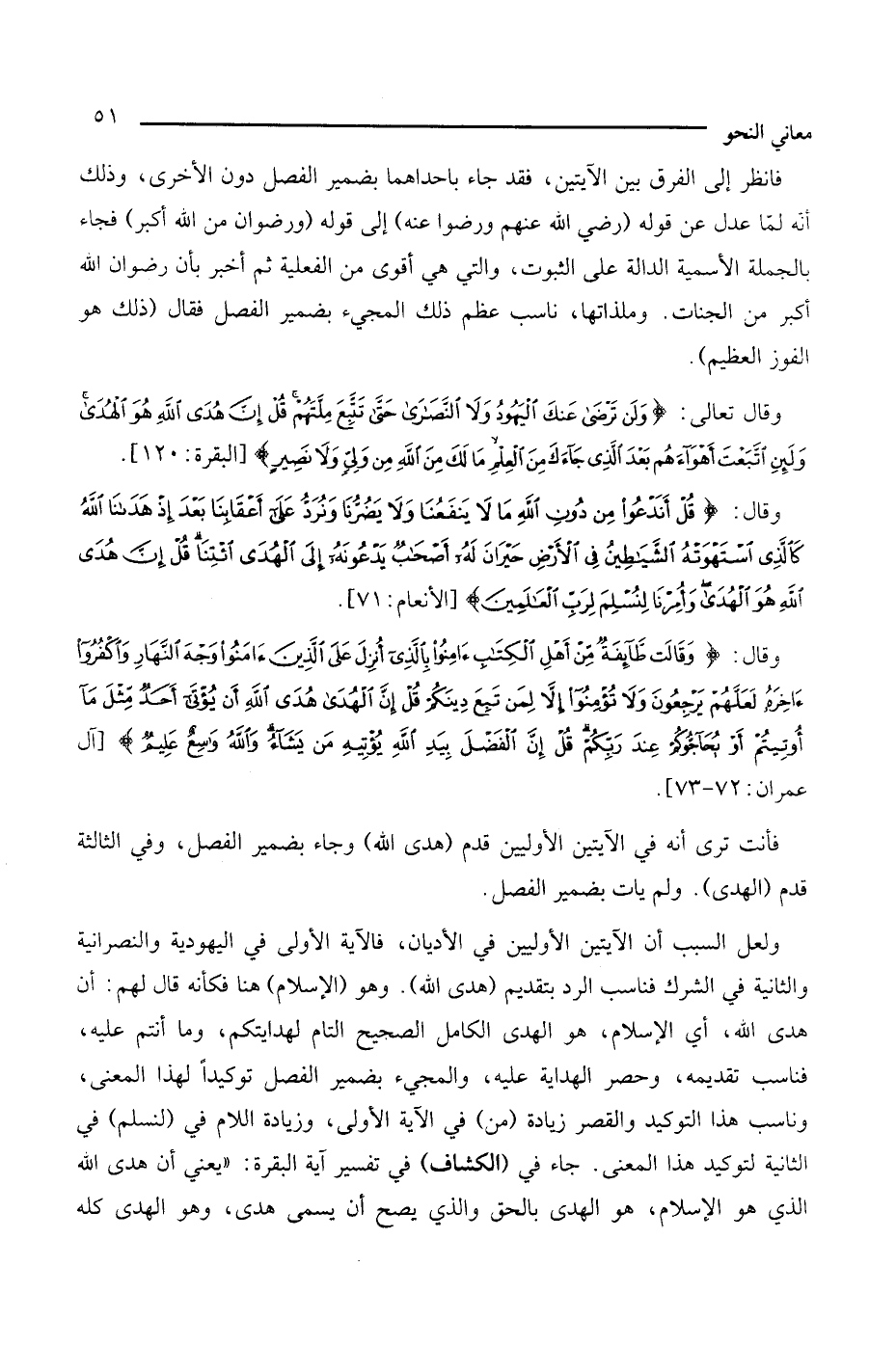 فانظر إلى الفرق بين الآيتين، فقد جاء بإحداهما بضمير الفصل دون الأخرى، وذلك أنه لما عدل عن قوله (رضي الله عنهم ورضوا عنه) إلى قوله (ورضوان من الله أكبر) فجاء بالجملة الإسمية الدالة على الثبوت، والتي هي أقوى من الفعلية ثم أخبر بأن رضوان الله أكبر من الجنات. وملذاتها، ناسب عظم ذلك المجيء بضمير الفصل فقال (ذلك هو الفوز العظيم).