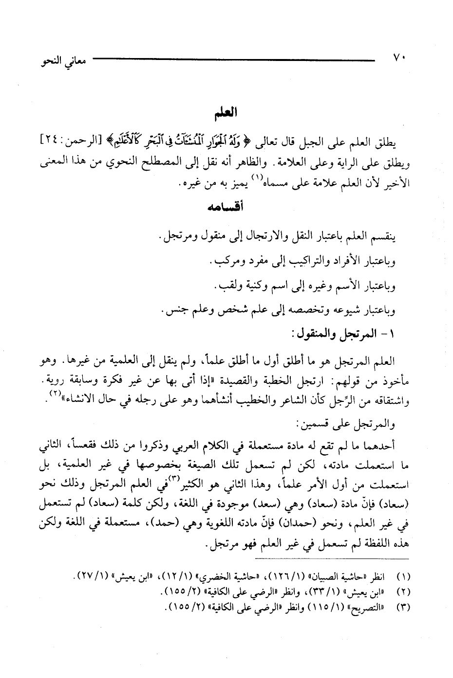 يطلق العلم على الجبل قال تعالى: {وله الجوار المنشآت في البحر كالأعلام} [الرحمن: 24]، ويطلق على الراية وعلى العلامة، والظاهر أنه نقل إلى المصطلح النحوي من هذا المعنى، الأخير، لأن العلم علامة على مسماه (¬1) يميز به من غيره.