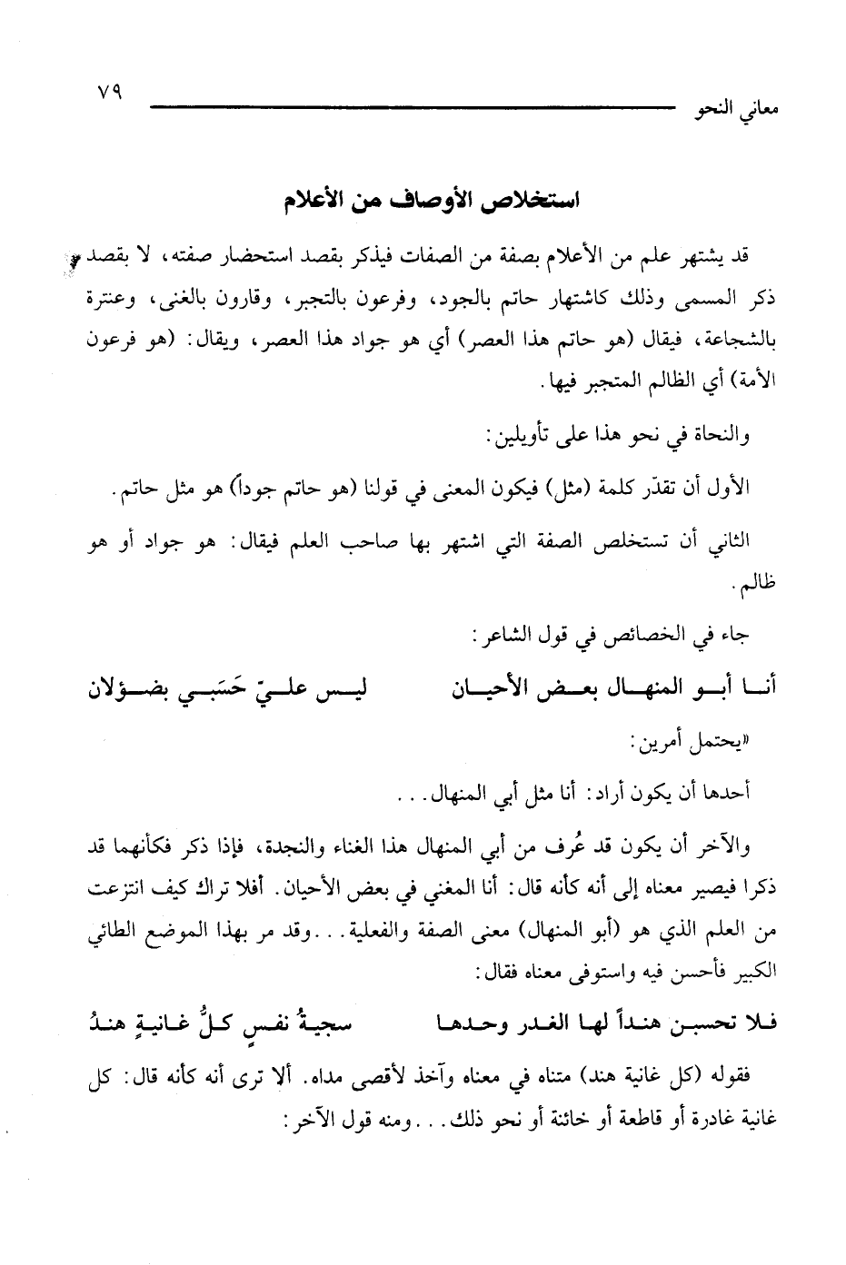 والآخر أن يكون قد عرف من أبي المنهال هذا الغناء والنجدة، فإذا ذكر فكأنهما قد ذكرا فيصير معناه إلى أنه كأنه قال: أنا المغني في بعض الأحيان. أفلا تراك كيف انتزعت من علم الذي هو (أبو المنهال) معنى الصفة والفعلية .. وقد مر بهذا الموضع الطائي الكبير فأحسن فيه واستوفى معناه فقال: