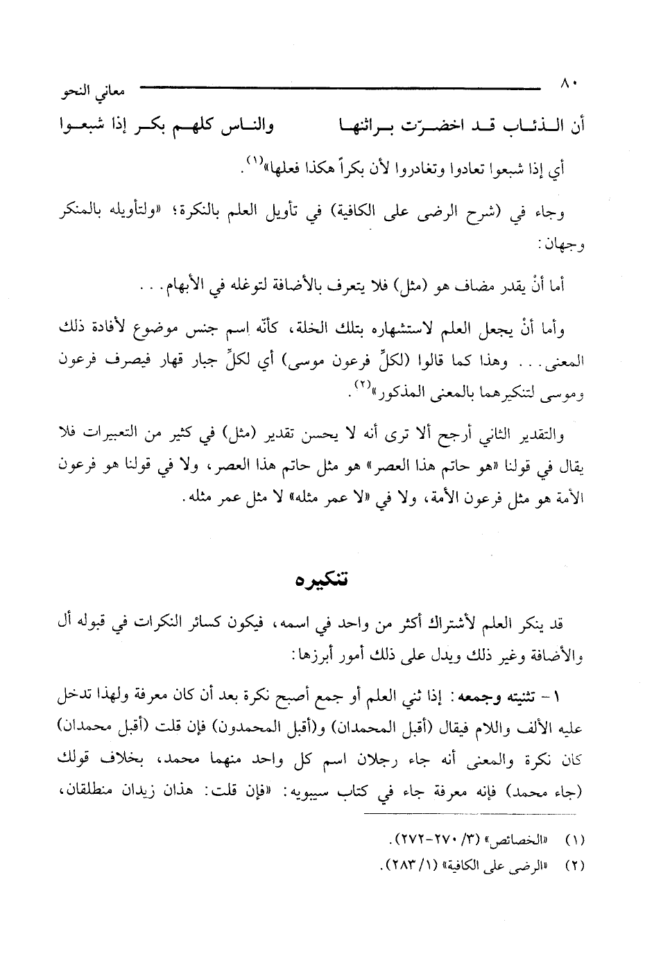 وجاء في شرح الرضى على الكافية في تأويل العلم بالنكرة، ولتأويله بالمنكر وجهان: