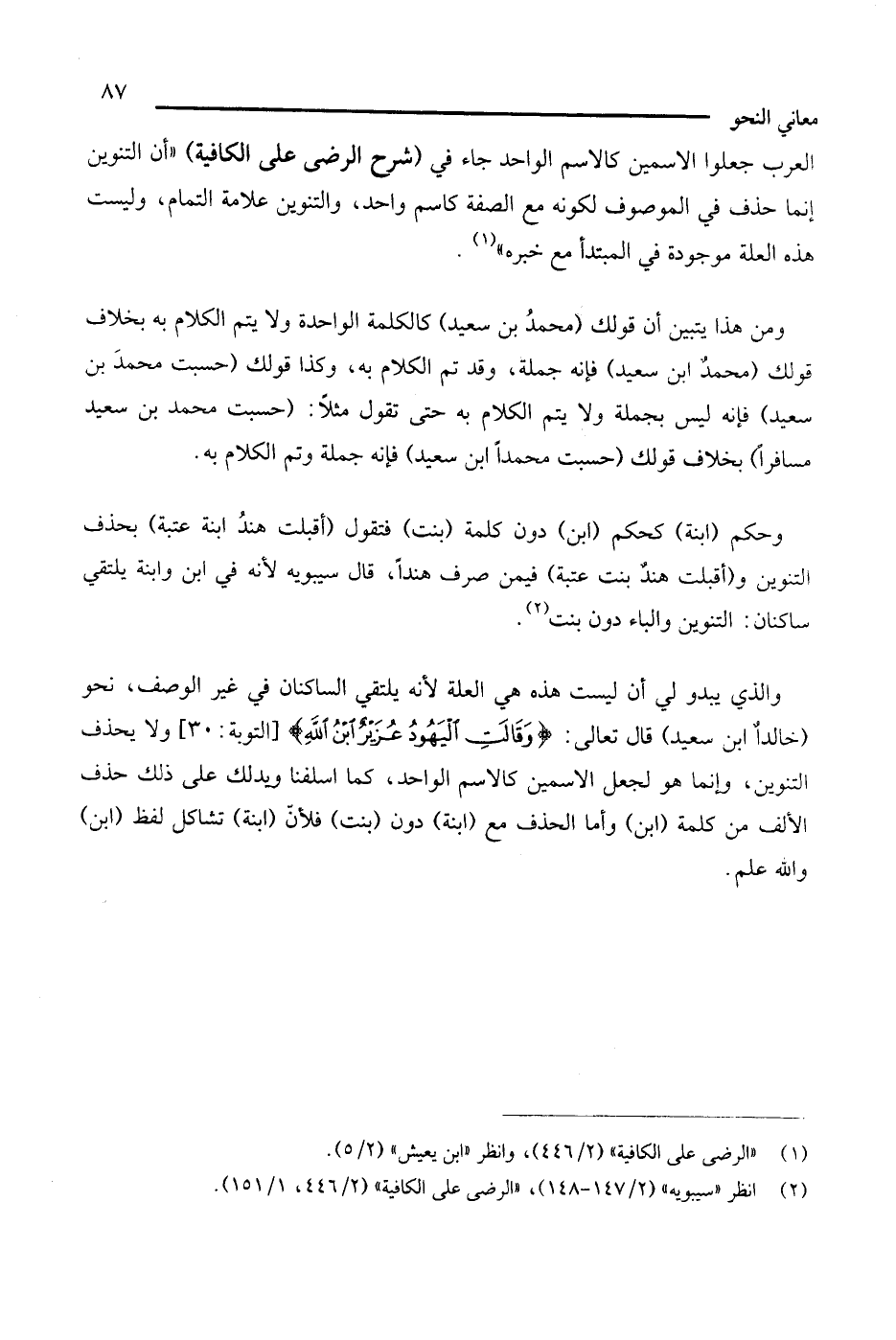 ومن هذا يتبين أن قولك (محمدُ بن سعيد) كالكلمة الواحدة ولا يتم الكلام به بخلاف قولك (محمدٌ ابن سعيد) فإنه جملة، وقد تم الكلام به وكذا قولك (حسبت محمدَ بن سعيد) فإنه ليس بجملة ولا يتم الكلام به حتى تقول مثلا: (حسبت محمد بن سعيد مسافرًا) بخلاف قولك (حسبت محمدًا ابن سعيد) فإنه جملة وتم الكلام به.