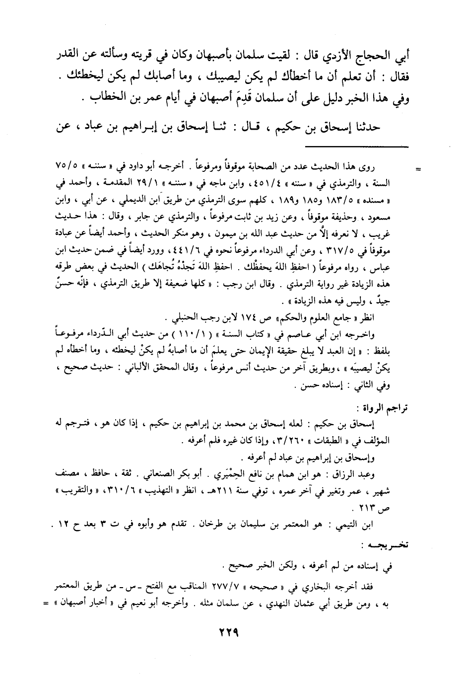 حَدَّثَنَا إِسْحَاقُ بْنُ حَكِيمٍ , قَالَ: ثنا إِسْحَاقُ بْنُ إِبْرَاهِيمَ بْنِ عَبَّادٍ , عَنْ -[230]- عَبْدِ الرَّزَّاقِ , عَنِ ابْنِ التَّيْمِيِّ , عَنْ أَبِيهِ , قَالَ: سَمِعْتُ سَلْمَانَ , «يَذْكُرُ أَنَّهُ §تَدَاوَلَهُ بَضْعَةَ عَشَرَ رَبًّا مِنْ رَبٍّ إِلَى رَبٍّ» وَذَكَرُوا أَنَّهُ مَاتَ بِالْمَدَائِنِ سَنَةَ ثَلَاثٍ وَثَلَاثِينَ سَمِعْتُ جَعْفَرَ بْنَ أَحْمَدَ بْنِ فَارِسَ يَقُولُ: سَمِعْتُ الْعَبَّاسَ يَقُولُ لِمُحَمَّدِ بْنِ النُّعْمَانِ: يَقُولُ أَهْلُ الْعِلْمِ عَاشَ سَلْمَانُ ثَلَاثَمِائَةٍ وَخَمْسِينَ سَنَةً، وَذَكَرَ بَعْضَ مَنْ عُنِيَ بِهَذَا الشَّأْنِ أَنَّ لِسَلْمَانَ رَهْطًا مِنْ وَلَدِ أَخِيهِ ماها -[231]- ذر فروخ قَدْ تَفَرَّقُوا فِي الْبُلْدَانِ , فَبِمَدِينَةِ شِيرَازَ مِنْ كُوَرِ فَارِسَ جَمَاعَةٌ مِنْهُمْ زَعِيمُهُمْ رَجُلٌ يُقَالُ لَهُ غَسَّانُ بْنُ زَاذَانَ بْنِ شَاذَوَيْهِ بْنِ ماه بنداد بْنِ ماها ذو فروخ أَخِي سَلْمَانَ بْنِ بدخشان وَمَعَهُمْ كِتَابُ النَّبِيِّ صَلَّى اللهُ عَلَيْهِ وَسَلَّمَ بِخَطِّ عَلِيِّ بْنِ أَبِي طَالِبٍ هُوَ فِي يَدِ غَسَّانَ هَذَا مَكْتُوبٌ فِي أَدِيمٍ أَبْيَضَ مَخْتُومٍ بِخَاتَمِ النَّبِيِّ صَلَّى اللهُ عَلَيْهِ وَسَلَّمَ وَخَاتَمِ أَبِي بَكْرٍ , وَعَلِيٍّ رَضِيَ اللَّهُ عَنْهُمَا , وَهَذِهِ نُسْخَةُ الْعَهْدِ: «بِسْمِ اللَّهِ الرَّحْمَنِ الرَّحِيمِ هَذَا كِتَابٌ مِنْ مُحَمَّدٍ رَسُولِ اللَّهِ صَلَّى اللهُ عَلَيْهِ وَسَلَّمَ سَأَلَهُ سَلْمَانُ وَصِيَّةً بِأَخِيهِ ماها ذر فروخ وَأَهْلِ بَيْتِهِ وَعَقِبِهِ مِنْ بَعْدِهِ مَا تَنَاسَلُوا , مَنْ أَسْلَمَ مِنْهُمْ وَأَقَامَ عَلَى دِينِهِ سَلَامُ اللَّهِ أَحْمَدُ إِلَيْكَ الَّذِي أَمَرَنِي أَنْ أَقُولَ لَا إِلَهَ إِلَّا اللَّهُ وَحْدَهُ لَا -[232]- شَرِيكَ لَهُ أَقُولُهَا , وَآمرُ النَّاسِ بِهَا إِنَّ الْخَلْقَ خَلْقَ اللَّهِ وَالْأَمْرَ كُلَّهُ لِلَّهِ خَلَقَهُمْ وَأَمَاتَهُمْ وَهُوَ يُنْشِئُهُمْ وَإِلَيْهِ الْمَصِيرُ وَإِنَّ كُلَّ أَمْرٍ يَزُولُ وَكُلَّ شَيْءٍ يَبِيدُ وَيَفْنَى وَكُلُّ نَفْسٍ ذَائِقَةُ الْمَوْتِ مَنْ آمَنَ بِاللَّهِ وَبِرُسُلِهِ كَانَ لَهُ فِي الْآخِرَةِ تُرْعَةُ الْفَائِزِينَ وَمَنْ أَقَامَ عَلَى دِينِهِ تَرَكْنَاهُ وَلَا إِكْرَاهَ فِي الدِّينِ , هَذَا كِتَابٌ لِأَهْلِ بَيْتِ سَلْمَانَ أَنَّ لَهُمْ ذِمَّةَ اللَّهِ وَذِمَّتِي عَلَى دِمَائِهِمْ وَأَمْوَالِهِمْ فِي الْأَرْضِ الَّتِي يُقِيمُونَ فِيهَا سَهْلِهَا وَجَبَلِهَا وَمَرَاعِيهَا وَعُيُونَهَا , غَيْرَ مَظْلُومِينَ وَلَا مَضِيقَ عَلَيْهِمْ فَمَنْ قُرِئَ عَلَيْهِ كِتَابِي هَذَا مِنَ الْمُؤْمِنِينَ وَالْمُؤْمِنَاتِ فَعَلَيْهِ أَنْ يَحْفَظَهُمْ وُيْكِرَمَهُمْ وَيَبَرَّهُمْ وَلَا يَتَعَرَّضُ لَهُمْ بِالْأَذَى وَالْمَكْرُوهِ وَقَدْ دَفَعْتُ عَنْهُمْ جَزَّ النَّاصِيَةِ , وَالْجِزْيَةَ , وَالْحَشْرَ , وَالْعُشْرَ , وَسَائِرَ الْمُؤَنِ , وَالْكُلَفِ ثُمَّ إِنْ سَأَلُوكُمْ فَأَعْطُوهُمْ وَإِنِ اسْتَغَاثُوكُمْ فَأَغِيثُوهُمْ وَإِنِ اسْتَجَارُوا بِكُمْ فَأَجِيرُوهُمْ وَإِنْ أَسَاءُوا فَاغْفِرُوا لَهُمْ وَإِنْ أُسِيءَ إِلَيْهِمْ فَامْنَعُوا عَنْهُمْ وَلَهُمْ أَنْ يُعْطَوْا مِنْ بَيْتِ مَالِ الْمُسْلِمِينَ فِي كُلِّ سَنَةٍ مِائَتَيْ حُلَّةٍ فِي شَهْرِ رَجَبٍ وَمِائَةً فِي الْأُضْحِيَّةِ فَقَدِ اسْتَحَقَّ سَلْمَانُ ذَلِكَ مِنَّا لِأَنَّ اللَّهَ تَبَارَكَ وَتَعَالَى قَدْ فَضَّلَ سَلْمَانَ عَلَى كَثِيرٍ مِنَ الْمُؤْمِنِينَ وَأَنْزَلَ عَلَيَّ فِي الْوَحْيِ أَنَّ الْجَنَّةَ إِلَى سَلْمَانَ أَشْوَقُ مِنْ سَلْمَانَ إِلَى الْجَنَّةِ , وَهُوَ ثِقَتِي وَأَمِينِي وَتَقِيُّ وَنَقِيُّ نَاصِحٌ لِرَسُولِ اللَّهِ صَلَّى 