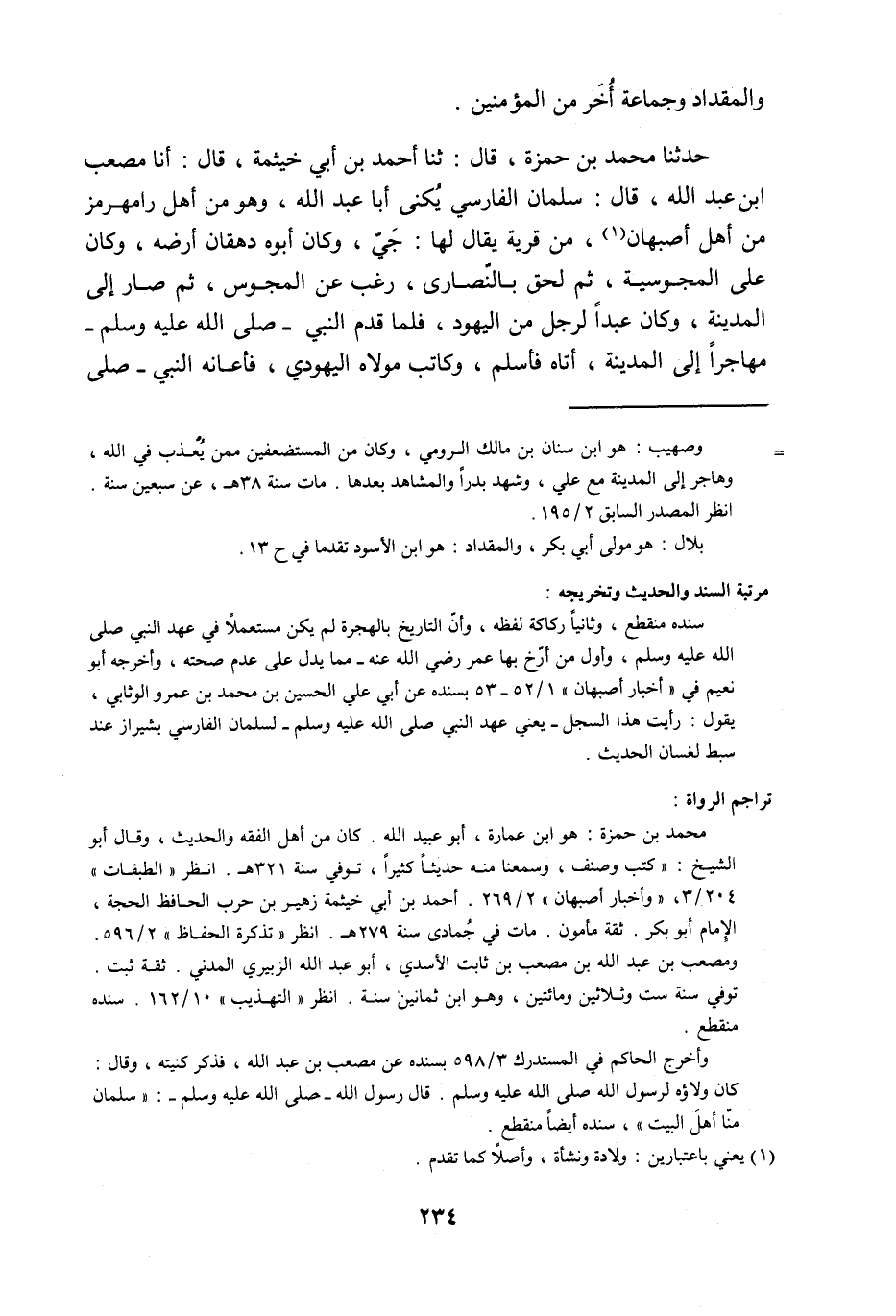 حَدَّثَنَا مُحَمَّدُ بْنُ حَمْزَةَ , قَالَ: ثنا أَحْمَدُ بْنُ أَبِي خَيْثَمَةَ , قَالَ أنا مُصْعَبُ بْنُ عَبْدِ اللَّهِ , قَالَ: §«سَلْمَانُ الْفَارِسِيُّ يُكَنَّى أَبَا عَبْدِ اللَّهِ وَهُوَ مِنْ أَهْلِ رامهرمز مِنْ أَهْلِ أَصْبَهَانَ مِنْ قَرْيَةٍ يُقَالُ لَهَا جَيُّ , وَكَانَ أَبُوهُ دِهْقَانَ أَرْضِهِ وَكَانَ عَلَى الْمَجُوسِيَّةِ ثُمَّ لَحِقَ بِالنَّصَارَى رَغِبَ عَنِ الْمَجُوسِ , ثُمَّ صَارَ إِلَى الْمَدِينَةِ وَكَانَ عَبْدًا لِرَجُلٍ مِنَ الْيَهُودِ فَلَمَّا قَدِمَ النَّبِيُّ صَلَّى اللهُ عَلَيْهِ وَسَلَّمَ مُهَاجِرًا إِلَى الْمَدِينَةِ أَتَاهُ فَأَسْلَمَ , وَكَاتَبَ مَوْلَاهُ الْيَهُودِيَّ , فَأَعَانَهُ النَّبِيُّ صَلَّى اللهُ عَلَيْهِ وَسَلَّمَ -[235]- وَالْمُسْلِمُونَ حَتَّى عَتَقَ , وَتُوُفِّيَ فِي وِلَايَةِ عُثْمَانَ بْنِ عَفَّانَ بِالْمَدَائِنِ»