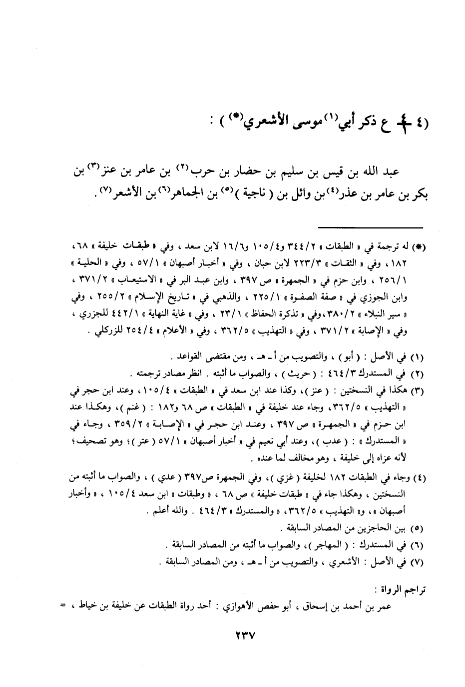 §ذِكْرُ أَبِي مُوسَى الْأَشْعَرِيِّ عَبْدُ اللَّهِ بْنُ قَيْسِ بْنِ سُلَيْمِ بْنِ حَضَارِ بْنِ حَرْبِ بْنِ عَامِرِ بْنِ عَنْزِ بْنِ بَكْرِ بْنِ عَامِرِ بْنِ عُذْرِ بْنِ وَائِلِ بْنِ نَاجِيَةَ بْنِ الْجَمَاهِرِ بْنِ الْأَشْعَرِ -[238]- حَدَّثَنَا بِنَسَبِهِ عُمَرُ بْنُ أَحْمَدَ بْنِ إِسْحَاقَ قَالَ: ثنا شَبَابٌ , تُوُفِّيَ سَنَةَ أَرْبَعٍ وَأَرْبَعِينَ. قَدِمَ عَلَى النَّبِيِّ صَلَّى اللهُ عَلَيْهِ وَسَلَّمَ بِخَيْبَرَ مَعَ سَفِينَةِ جَعْفَرِ بْنِ أَبِي طَالِبٍ. وَقِيلَ: لَهُ ابْنٌ بِأَصْبَهَانَ يُقَالُ إِنَّ اسْمَهُ مُوسَى قُتِلَ بِفَتْحِ -[239]- جاورسان