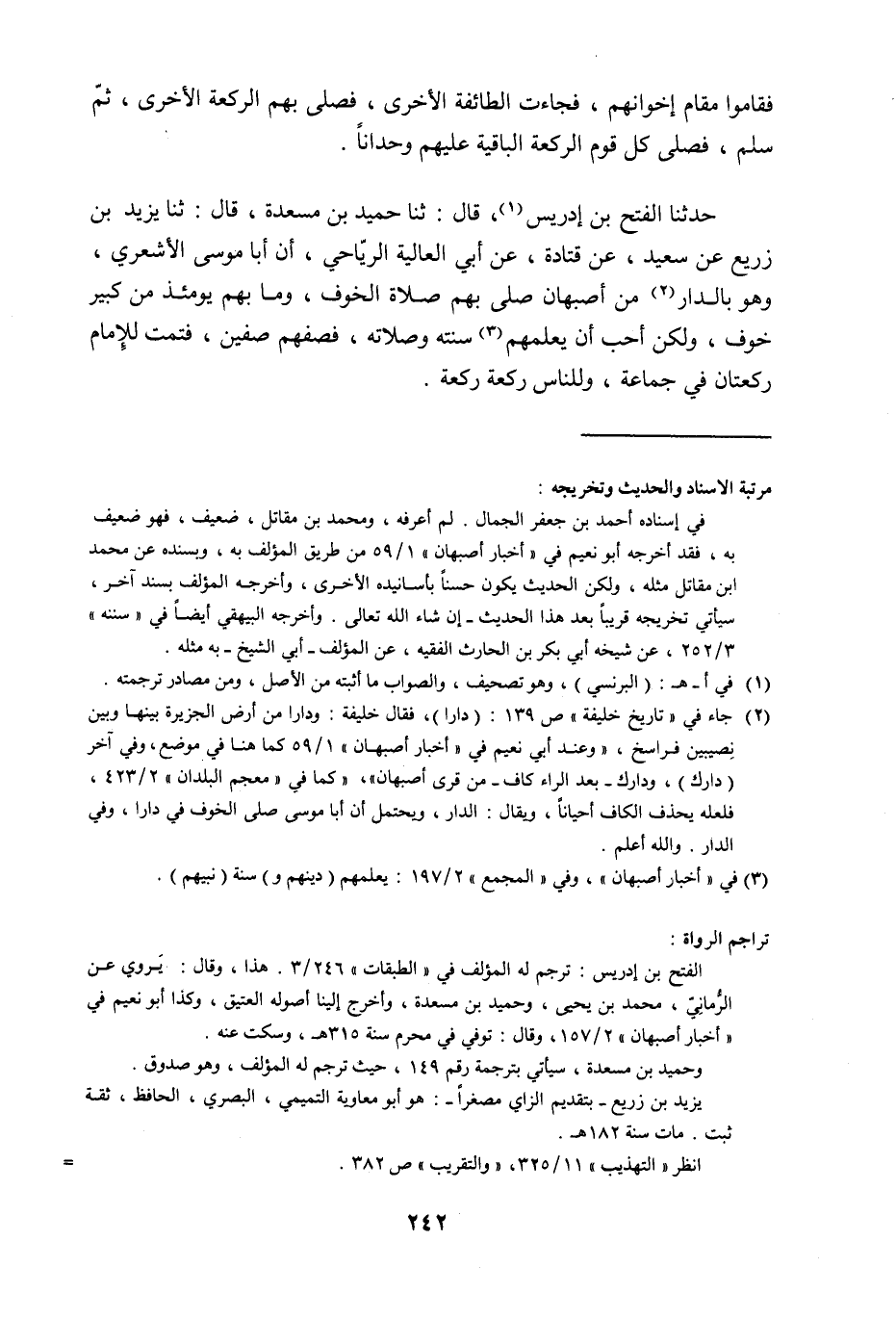 حَدَّثَنَا الْفَتْحُ بْنُ إِدْرِيسَ , قَالَ: ثنا حُمَيْدُ بْنُ مَسْعَدَةَ , قَالَ: ثنا يَزِيدُ بْنُ زُرَيْعٍ , عَنْ سَعِيدٍ , عَنْ قَتَادَةَ , عَنْ أَبِي الْعَالِيَةِ الرِّيَاحِيِّ , أَنَّ أَبَا مُوسَى الْأَشْعَرِيَّ , وَهُوَ بِالدَّارِ مِنْ أَصْبَهَانَ §صَلَّى بِهِمْ صَلَاةَ الْخَوْفِ وَمَا بِهِمْ يَوْمَئِذٍ مِنْ كَبِيرِ خَوْفٍ , وَلَكِنْ أَحَبَّ أَنْ يُعَلِّمَهُمْ سُنَّتَهَ وَصَلَاتَهُ , فَصَفَّهُمْ صَفَّيْنِ فَتَمَّتْ لِلْإِمَامِ رَكْعَتَانِ فِي جَمَاعَةٍ وَلِلنَّاسِ رَكْعَةٌ رَكْعَةٌ "