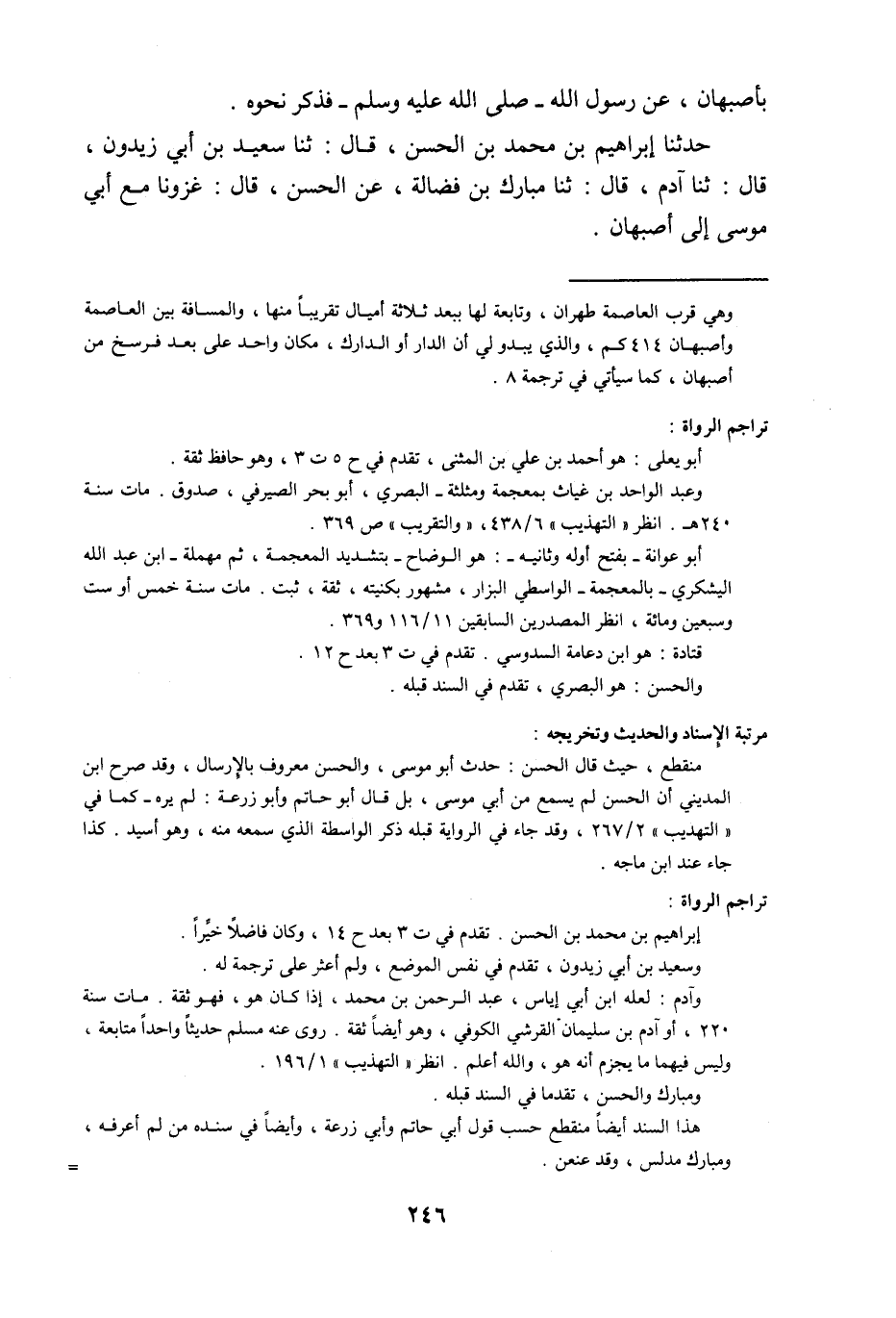 حَدَّثَنَا إِبْرَاهِيمُ بْنُ مُحَمَّدِ بْنِ الْحَسَنِ , قَالَ: ثنا سَعِيدُ بْنُ أَبِي زَيْدُونَ , قَالَ: ثنا آدَمُ , قَالَ: ثنا مُبَارَكُ بْنُ فَضَالَةَ , عَنِ الْحَسَنِ , قَالَ: §«غَزَوْنَا مَعَ أَبِي مُوسَى إِلَى أَصْبَهَانَ»
