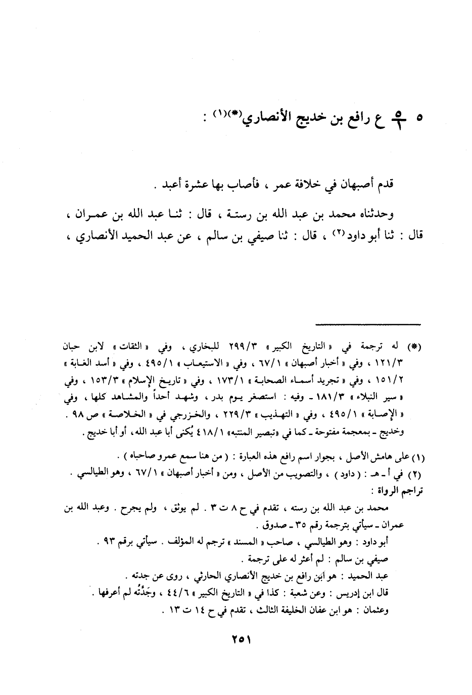§رَافِعُ بْنُ خَدِيجٍ الْأَنْصَارِيُّ قَدِمَ أَصْبَهَانَ فِي خِلَافَةِ عُمَرَ فَأَصَابَ بِهَا عَشَرَةَ أَعْبُدٍ