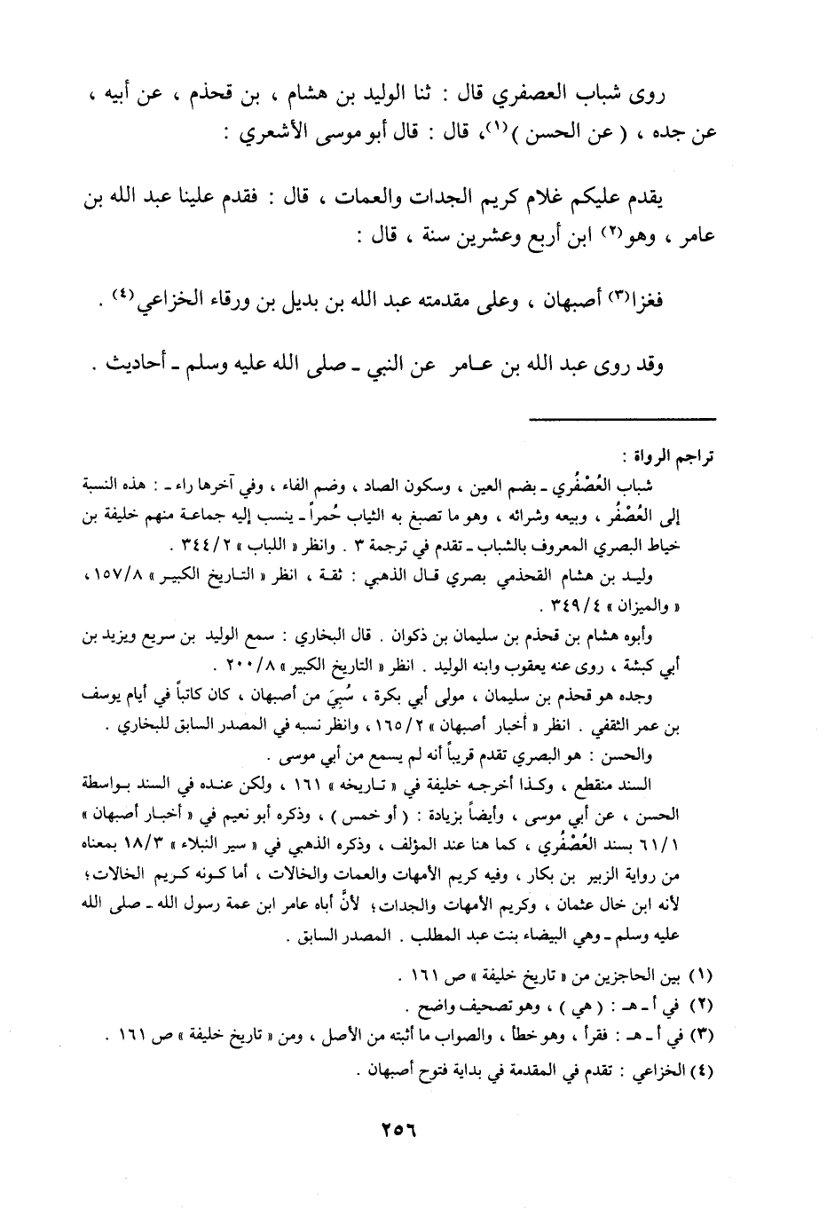 رَوَى شَبَابٌ الْعُصْفُرِيُّ قَالَ: ثنا الْوَلِيدُ بْنُ هِشَامِ بْنِ قَحْذَمٍ , عَنْ أَبِيهِ , عَنْ جَدِّهِ , عَنِ الْحَسَنِ قَالَ: قَالَ أَبُو مُوسَى الْأَشْعَرِيُّ: «§يَقْدَمُ عَلَيْكُمْ غُلَامٌ كَرِيمُ الْجَدَّاتِ وَالْعَمَّاتِ» قَالَ: فَقَدِمَ عَلَيْنَا عَبْدُ اللَّهِ بْنُ عَامِرٍ وَهُوَ ابْنُ أَرْبَعٍ وَعِشْرِينَ سَنَةً قَالَ: فَغَزَا أَصْبَهَانَ وَعَلَى مُقَدِّمَتِهِ عَبْدُ اللَّهِ بْنُ بُدَيْلِ بْنِ وَرْقَاءَ الْخُزَاعِيُّ " وَقَدْ رَوَى عَبْدُ اللَّهِ بْنُ عَامِرٍ عَنِ النَّبِيِّ صَلَّى اللهُ عَلَيْهِ وَسَلَّمَ أَحَادِيثَ