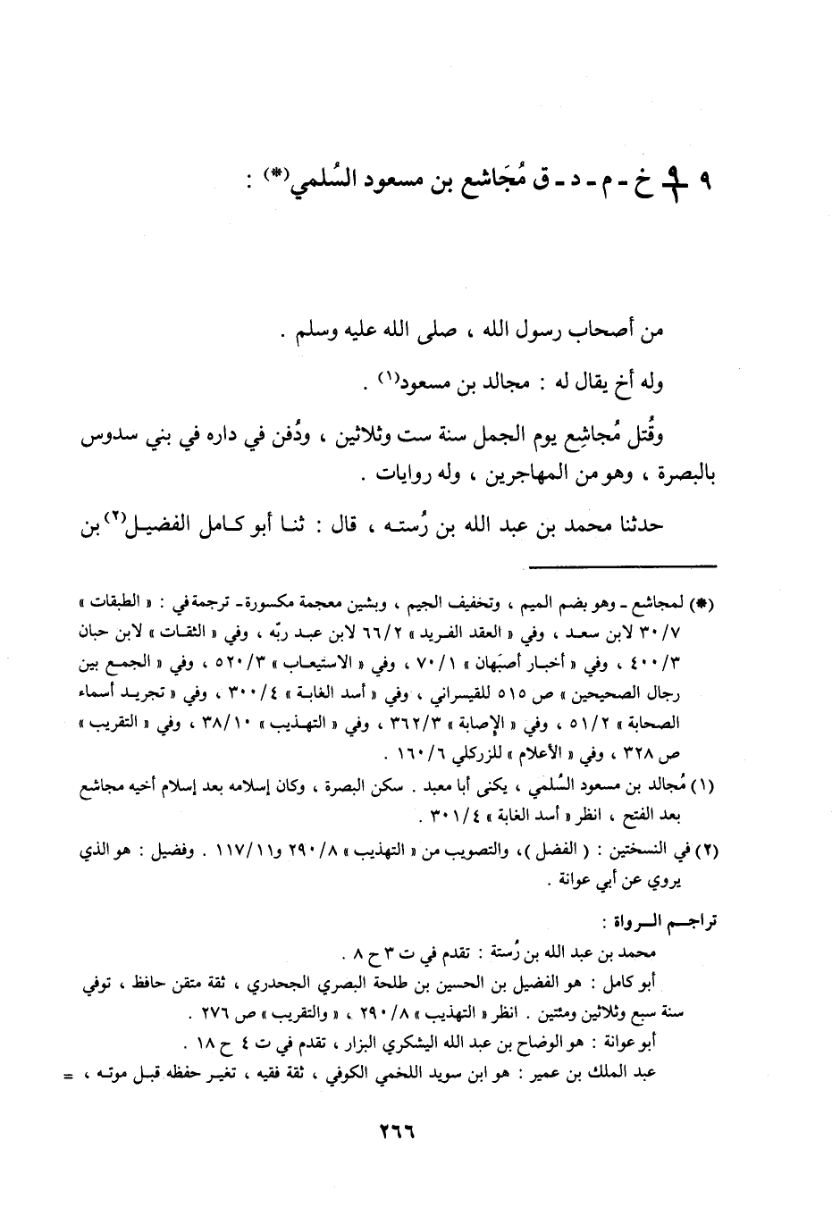 §مُجَاشِعُ بْنُ مَسْعُودٍ السُّلَمِيُّ مِنْ أَصْحَابِ رَسُولِ اللَّهِ صَلَّى اللهُ عَلَيْهِ وَسَلَّمَ وَلَهُ أَخٌ يُقَالُ لَهُ مُجَالِدُ بْنُ مَسْعُودٍ , وَقُتِلَ مُجَاشِعٌ يَوْمَ الْجَمَلِ سَنَةَ سِتٍّ وَثَلَاثِينَ وَدُفِنَ فِي دَارِهِ فِي بَنِي سَدُوسٍ بِالْبَصْرَةِ وَهُوَ مِنَ الْمُهَاجِرِينَ وَلَهُ رِوَايَاتٌ