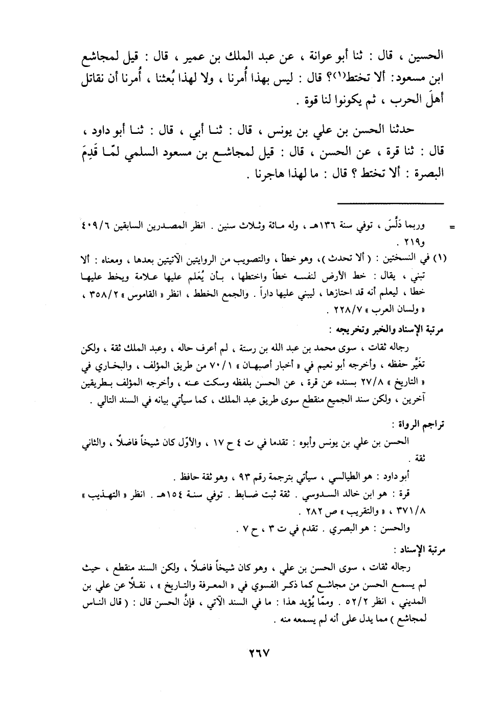 حَدَّثَنَا الْحَسَنُ بْنُ عَلِيِّ بْنِ يُونُسَ , قَالَ: ثنا أَبِي , قَالَ: ثنا أَبُو دَاوُدَ , قَالَ: ثنا قُرَّةُ , عَنِ الْحَسَنِ , قَالَ: قِيلَ لِمُجَاشِعِ بْنِ مَسْعُودٍ السُّلَمِيِّ , لَمَّا قَدِمَ الْبَصْرَةَ: §أَلَا تَخْتَطُّ؟ قَالَ: «مَا لِهَذَا هَاجَرْنَا»