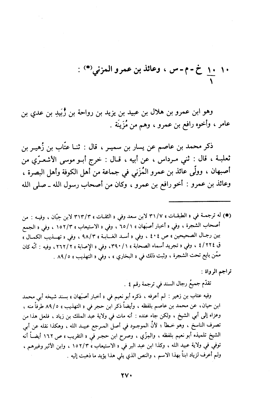 §وَعَائِذُ بْنُ عَمْرٍو الْمُزَنِيُّ وَهُوَ ابْنُ عَمْرِو بْنِ هِلَالِ بْنِ عُبَيْدِ بْنِ يَزِيدَ بْنِ رَوَاحَةَ بْنِ زُبَيْدِ بْنِ عَدِيِّ بْنِ عَامِرٍ , وَأَخُوهُ رَافِعُ بْنُ عَمْرٍو , وَهُمْ مِنْ مُزَيْنَةَ ذَكَرَ مُحَمَّدُ بْنُ عَاصِمٍ عَنْ يَسَارِ بْنِ سُمَيْرٍ قَالَ: ثنا عَتَّابُ بْنُ زُهَيْرِ بْنِ ثَعْلَبَةَ قَالَ: ثني مِرْدَاسٌ عَنْ أَبِيهِ قَالَ: خَرَجَ أَبُو مُوسَى الْأَشْعَرِيُّ مِنْ أَصْبَهَانَ وَوَلَّى عَائِذَ بْنَ عَمْرٍو الْمُزَنِيَّ فِي جَمَاعَةٍ مِنْ أَهْلِ الْكُوفَةِ وَأَهْلِ الْبَصْرَةِ , وَعَائِذُ بْنُ عَمْرٍو أَخُو رَافِعِ بْنِ عَمْرٍو وَكَانَ مِنْ أَصْحَابِ رَسُولِ اللَّهِ صَلَّى اللهُ عَلَيْهِ وَسَلَّمَ , -[271]- مَاتَ بِالْبَصْرَةِ وَقَبْرُهُ فِي شارعِ الْمِرْبَدِ عِنْدَ الْمَنَارَةِ وَمَاتَ عَائِذٌ فِي وِلَايَةِ عُبَيْدِ اللَّهِ بْنِ زِيَادٍ , يُكَنَّى أَبَا هُبَيْرَةَ