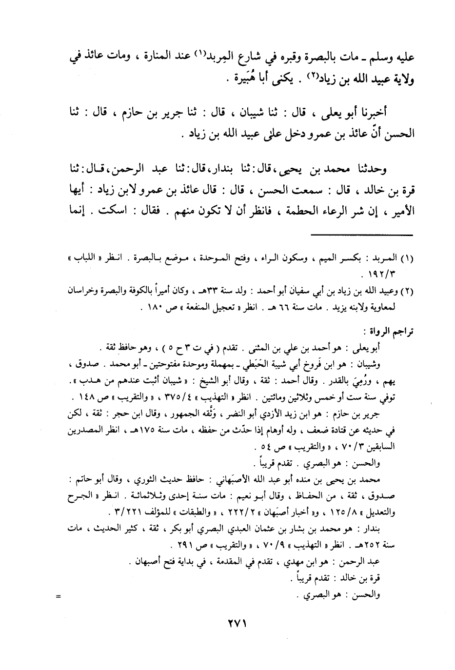 أَخْبَرَنَا أَبُو يَعْلَى , قَالَ: ثنا شَيْبَانُ , قَالَ: ثنا جَرِيرُ بْنُ حَازِمٍ , قَالَ: ثنا الْحَسَنُ , أَنَّ عَائِذَ بْنَ عَمْرٍو , دَخَلَ عَلَى عُبَيْدِ اللَّهِ بْنِ زِيَادٍ , وَحَدَّثَنَا مُحَمَّدُ بْنُ يَحْيَى , قَالَ: ثنا بُنْدَارٌ , قَالَ: ثنا عَبْدُ الرَّحْمَنِ , قَالَ: ثنا قُرَّةُ بْنُ خَالِدٍ , قَالَ: سَمِعْتُ الْحَسَنَ , قَالَ: قَالَ عَائِذُ بْنُ عَمْرٍو لِابْنِ زِيَادٍ: «أَيُّهَا الْأَمِيرُ إِنَّ §شَرَّ الرِّعَاءِ الْحُطَمَةُ فَانْظُرْ أَنْ لَا تَكُونَ مِنْهُمْ» , فَقَالَ: اسْكُتْ -[272]- إِنَّمَا أَنْتَ مِنْ نُخَالَةِ أَصْحَابِ مُحَمَّدِ صَلَّى اللهُ عَلَيْهِ وَسَلَّمَ , فَقَالَ: «وَكَانَتْ لَهُمْ نُخَالَةٌ ؟»