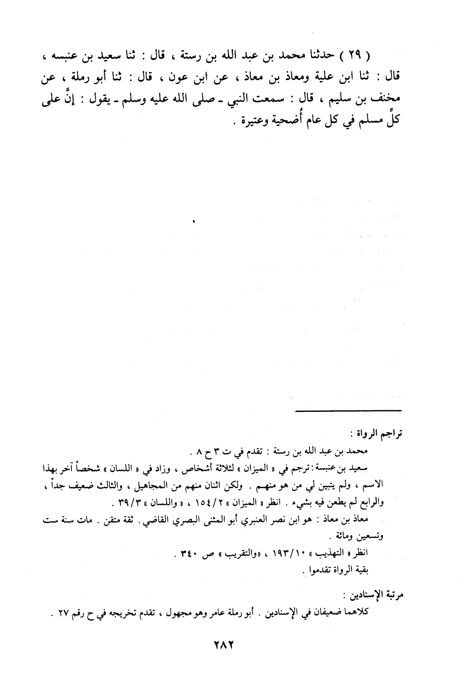 حَدَّثَنَا مُحَمَّدُ بْنُ عَبْدِ اللَّهِ بْنِ رُسْتَهْ , قَالَ: ثنا سَعِيدُ بْنُ عَنْبَسَةَ , قَالَ: ثنا ابْنُ عُلَيَّةَ , وَمُعَاذُ بْنُ مُعَاذٍ , عَنِ ابْنِ عَوْنٍ , قَالَ: ثنا أَبُو رَمْلَةُ , عَنْ مِخْنَفِ بْنِ سُلَيْمٍ , قَالَ: سَمِعْتُ النَّبِيَّ صَلَّى اللهُ عَلَيْهِ وَسَلَّمَ يَقُولُ: «إِنَّ §عَلَى كُلِّ مُسْلِمٍ فِي كُلِّ عَامٍ أُضْحِيَّةً وَعَتِيرَةً»