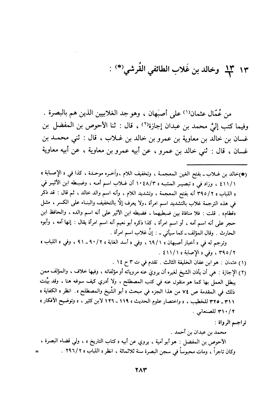 §13 - وَخَالِدُ بْنُ غَلَّابٍ الطَّائِفِيُّ الْقُرَشِيُّ مِنْ عُمَّالِ عُثْمَانَ عَلَى أَصْبَهَانَ وَهُوَ جَدُّ الْغَلَّابِيِّينَ الَّذِينَ هُمْ بِالْبَصْرَةِ