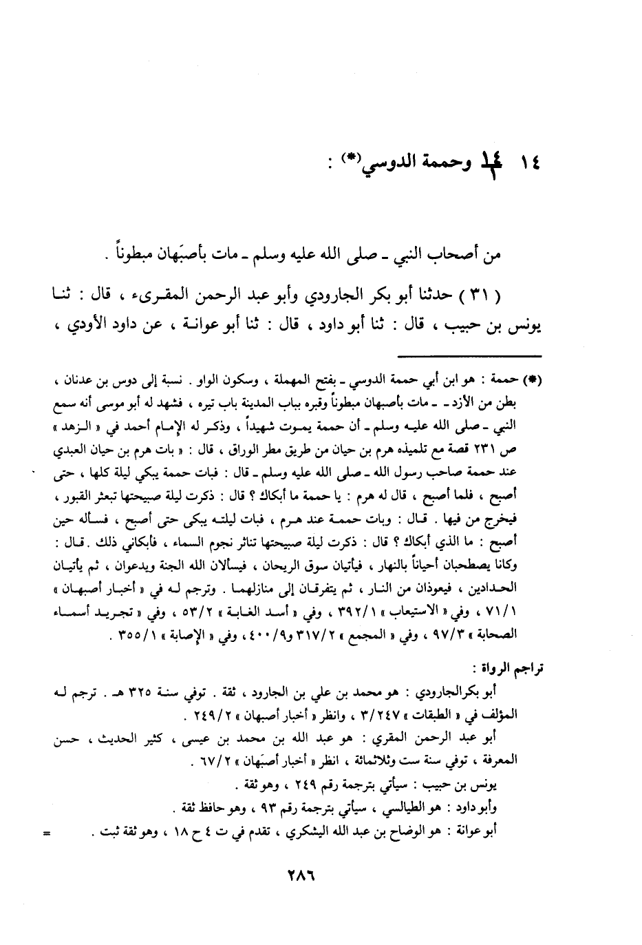 §14 - وَحُمَمَةُ الدَّوْسِيُّ مِنْ أَصْحَابِ النَّبِيِّ صَلَّى اللهُ عَلَيْهِ وَسَلَّمَ مَاتَ بِأَصْبَهَانَ مَبْطُونًا