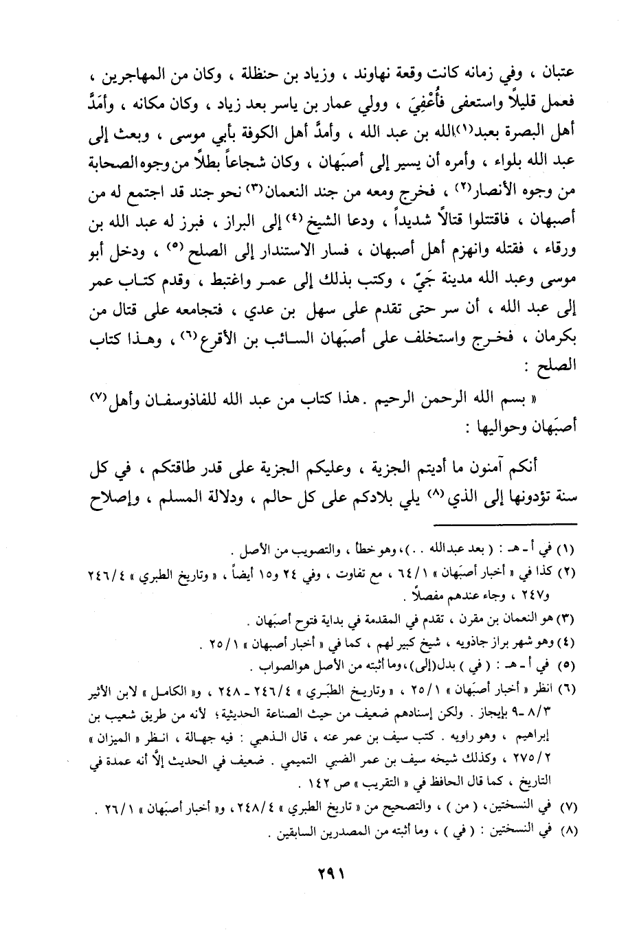 عِتْبَانَ وَفِي زَمَانِهِ كَانَتْ وَقْعَةُ نَهَاوَنْدَ , وَزِيَادُ بْنُ حَنْظَلَةَ وَكَانَ مِنَ الْمُهَاجِرِينَ فَعَمِلَ قَلِيلًا وَاسْتَعْفَى فَأُعْفِيَ , وَوُلِّيَ عَمَّارُ بْنُ يَاسِرٍ بَعْدَ زِيَادٍ , وَكَانَ مَكَانَهُ , وَأَمَدَّ أَهْلَ الْبَصْرَةِ بِعَبْدِ اللَّهِ بْنِ عَبْدِ اللَّهِ , وَأَمَدَّ أَهْلَ الْكُوفَةِ بِأَبِي مُوسَى , وَبَعَثَ إِلَى عَبْدِ اللَّهِ بِلِوَاءٍ وَأَمَرَهُ أَنْ يَسِيرَ إِلَى أَصْبَهَانَ , وَكَانَ شُجَاعًا بَطَلًا مِنْ وُجُوهِ الصَّحَابَةِ مِنْ وُجُوهِ الْأَنْصَارِ فَخَرَجَ وَمَعَهُ مِنْ جُنْدِ النُّعْمَانِ نَحْوُ جُنْدٍ قَدِ اجْتَمَعَ لَهُ مِنْ أَصْبَهَانَ فَاقْتَتَلُوا قِتَالًا شَدِيدًا وَدَعَا الشَّيْخُ إِلَى الْبَرَازِ فَبَرَزَ لَهُ عَبْدُ اللَّهِ بْنُ وَرْقَاءَ فَقَتَلَهُ وَانْهَزَمَ أَهْلُ أَصْبَهَانَ فَسَارَ الِاسْتِنْدَارُ إِلَى الصُّلْحِ , وَدَخَلَ أَبُو مُوسَى , وَعَبْدُ اللَّهِ مَدِينَةَ جَيٍّ وَكَتَبَ بِذَلِكَ إِلَى عُمَرَ , وَاغْتَبَطَ وَقَدِمَ كِتَابُ عُمَرَ إِلَى عَبْدِ اللَّهِ أَنْ سِرْ حَتَّى تَقْدَمَ عَلَى سَهْلِ بْنِ عَدِيٍّ , فَتُجَامِعَهُ عَلَى قِتَالِ مَنْ بكرمان , فَخَرَجَ وَاسْتَخْلَفَ عَلَى أَصْبَهَانَ السَّائِبَ بْنَ الْأَقْرَعِ , وَهَذَا كِتَابُ الصُّلْحِ: " بِسْمِ اللَّهِ الرَّحْمَنِ الرَّحِيمِ هَذَا كِتَابٌ مِنْ عَبْدِ اللَّهِ للفاذوسفان وَأَهْلِ أَصْبَهَانَ وَحَوَالَيْهَا: إِنَّكُمْ آمِنُونَ مَا أَدَّيْتُمُ الْجِزْيَةَ وَعَلَيْكُمُ الْجِزْيَةُ عَلَى قَدْرِ طَاقَتِكُمْ فِي كُلِّ سَنَةٍ تُؤَدُّونَهَا إِلَى الَّذِي يَلِي بِلَادَكُمْ عَلَى كُلِّ حَالِمٍ , وَدِلَالَةِ الْمُسْلِمِ وَإِصْلَاحِ