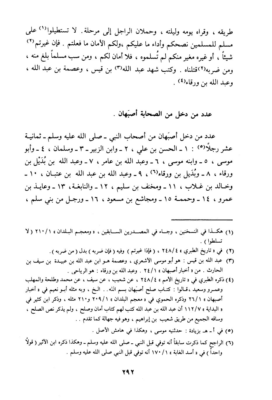 §عَدَدُ مَنْ دَخَلَ مِنَ الصَّحَابَةِ أَصْبَهَانَ عَدَدُ مَنْ دَخَلَ أَصْبَهَانَ مِنْ أَصْحَابِ النَّبِيِّ صَلَّى اللهُ عَلَيْهِ وَسَلَّمَ ثَمَانِيَةَ عَشَرَ رَجُلًا: (1) الْحَسَنُ بْنُ عَلِيٍّ (2) وَابْنُ الزُّبَيْرِ (3) وَسَلْمَانُ (4) وَأَبُو مُوسَى (5) وَابْنُهُ مُوسَى (6) وَعَبْدُ اللَّهِ بْنُ عَامِرٍ (7) وَعَبْدُ اللَّهِ بْنُ بُدَيْلِ بْنِ وَرْقَاءَ (8) وَبُدَيْلُ بْنُ وَرْقَاءَ (9) وَعَبْدُ اللَّهِ بْنُ عَبْدِ اللَّهِ بْنِ عِتْبَانَ (10) وَخَالِدُ بْنُ غَلَّابٍ (11) وَمِخْنَفُ بْنُ سُلَيْمٍ (12) وَالنَّابِغَةُ (13) وَعَايِذُ بْنُ عَمْرٍو (14) وَحُمَمَةُ (15) وَمُجَاشِعُ بْنُ مَسْعُودٍ (16) وَرَجُلٌ مِنْ بَنِي سَلْمٍ -[293]- (17) وَعَبْدُ اللَّهِ بْنُ يَزِيدَ الْخَطْمِيُّ (18) وَرَافِعُ بْنُ خَدِيجٍ