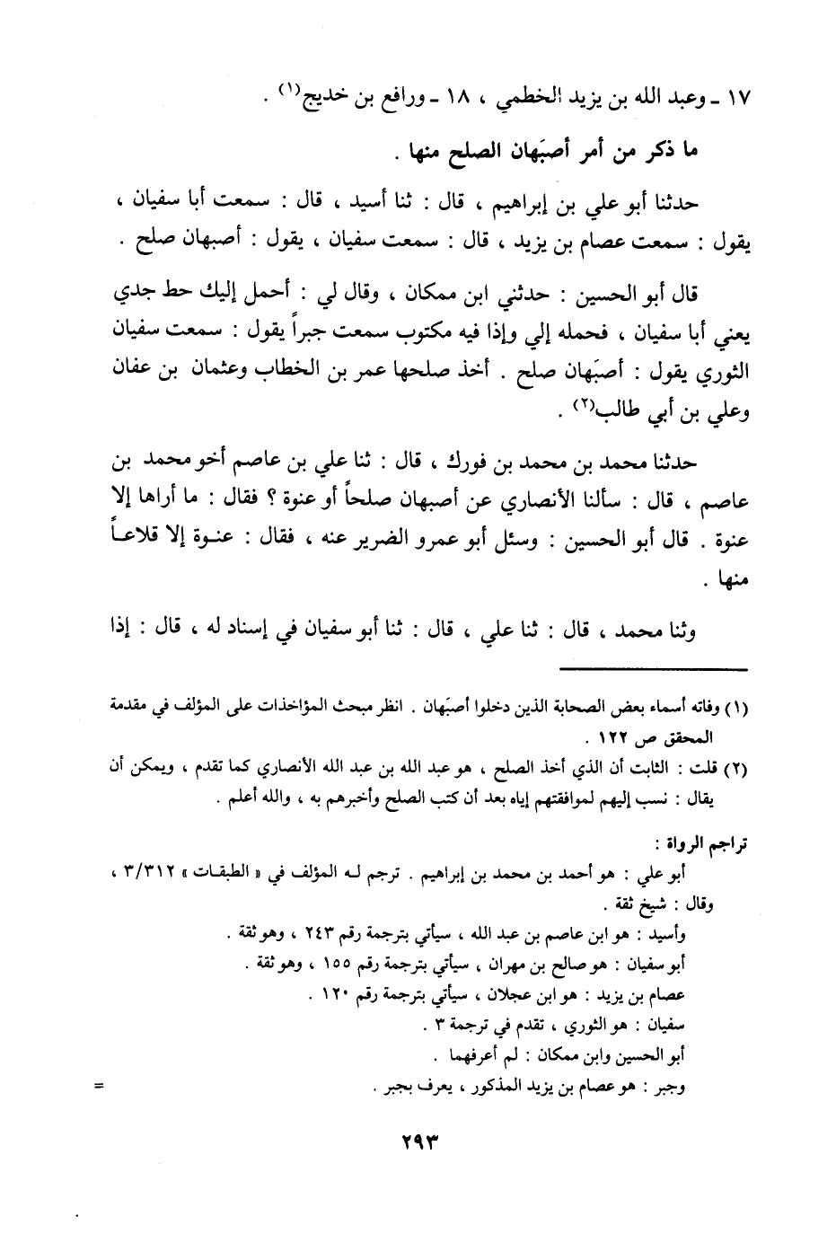 حَدَّثَنَا أَبُو عَلِيِّ بْنُ إِبْرَاهِيمَ , قَالَ: ثنا أُسَيْدٌ , قَالَ: سَمِعْتُ أَبَا سُفْيَانَ , يَقُولُ: سَمِعْتُ عِصَامَ بْنَ يَزِيدَ , قَالَ: سَمِعْتُ سُفْيَانَ , يَقُولُ: §«أَصْبَهَانُ صُلْحٌ»